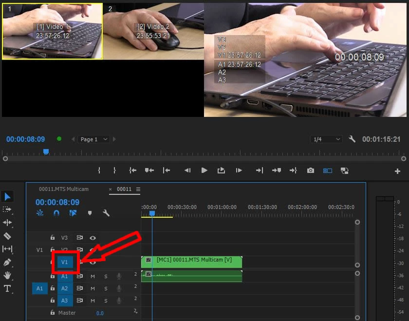To summarise, the multicam video track (V1) was not targeted and a different video track was targeting in the timeline.