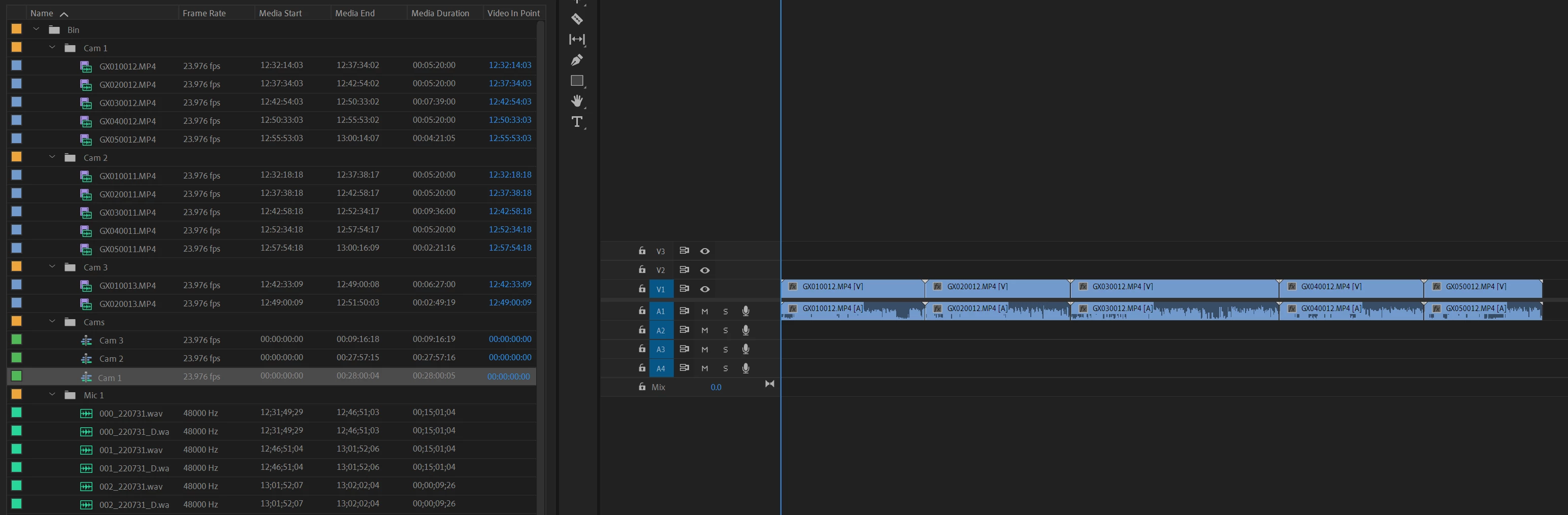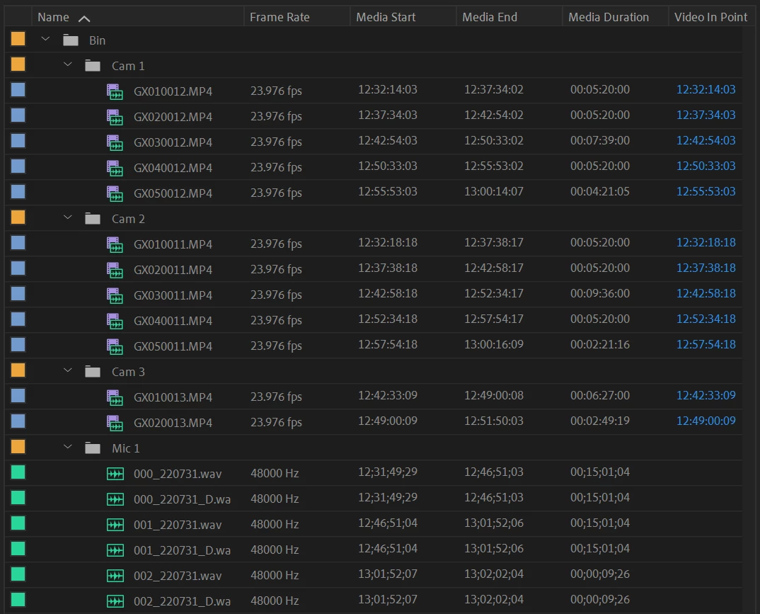 My cameras and my audio recorders don't give me a single file from a recording session, but instead, I get many sequential clips. I'm trying to create a multi-cam sequence in Adobe Premiere with the 3 cameras and a single high-quality audio track. For reference, the video came for GoPro Hero 9 Black and the audio from a Tascam DR-10L. My sources look like this: