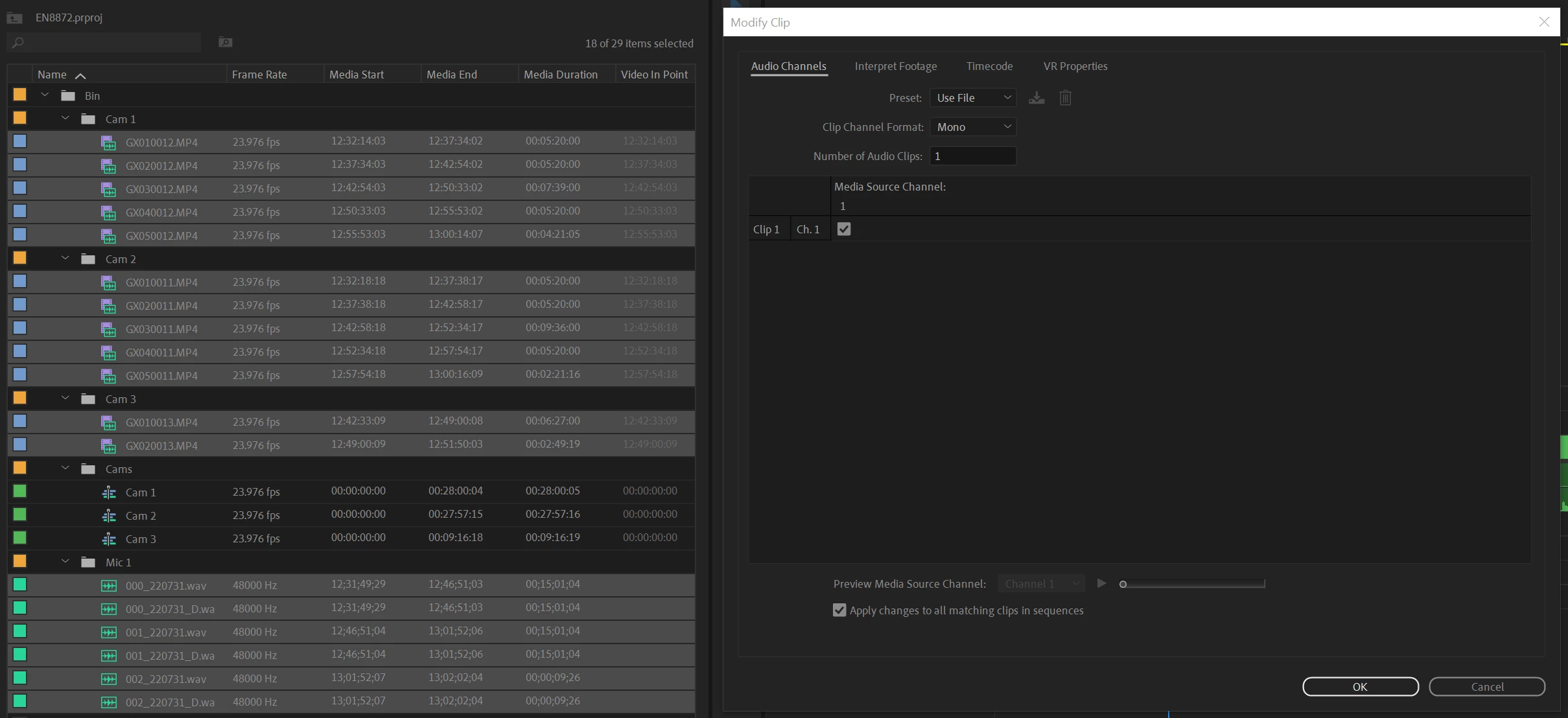The audio from the Tascam DR-10L is mono, while the audio from the cameras is stereo. I'm happy to work in mono, so I selected all clips and switched them to mono: