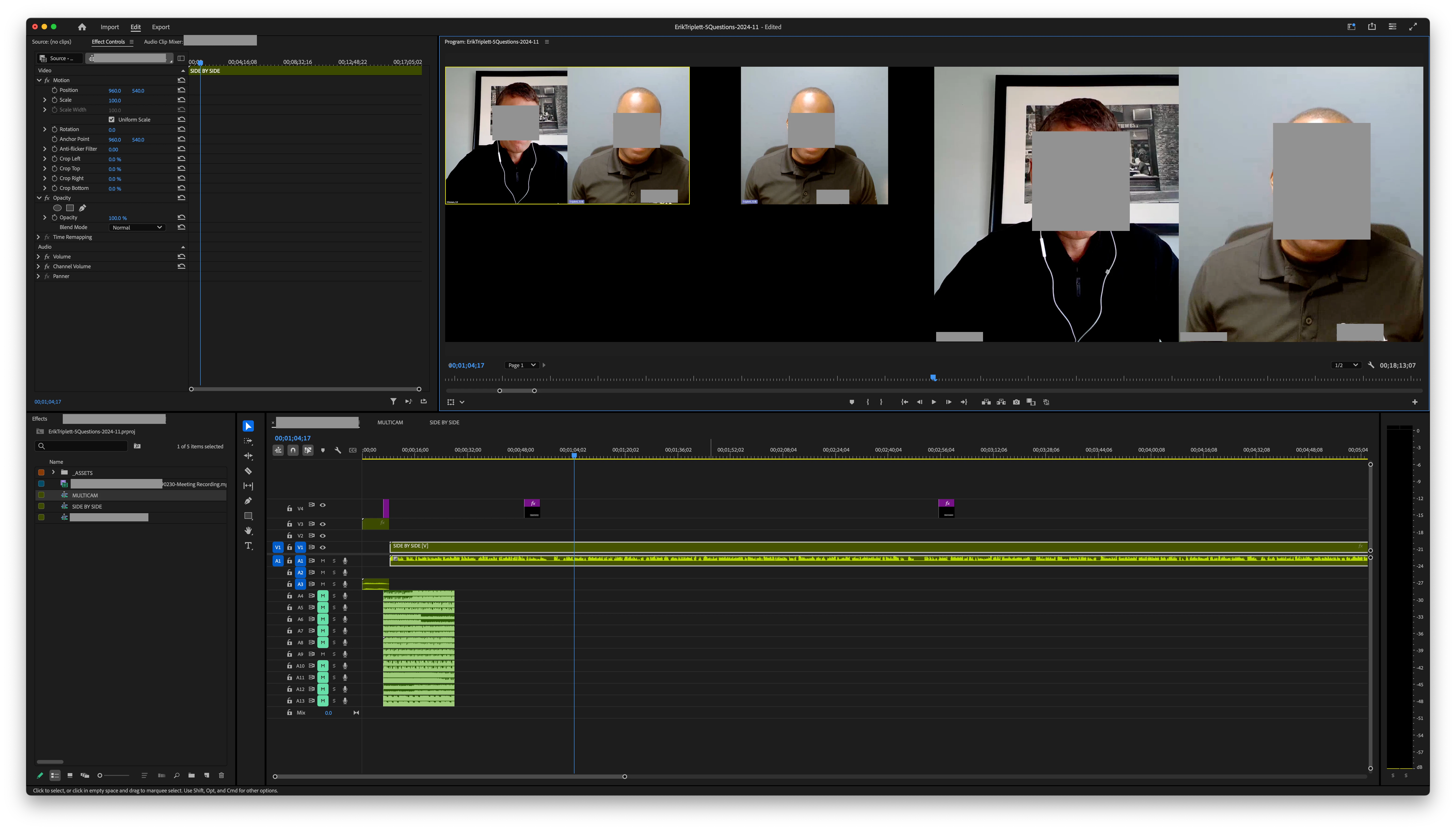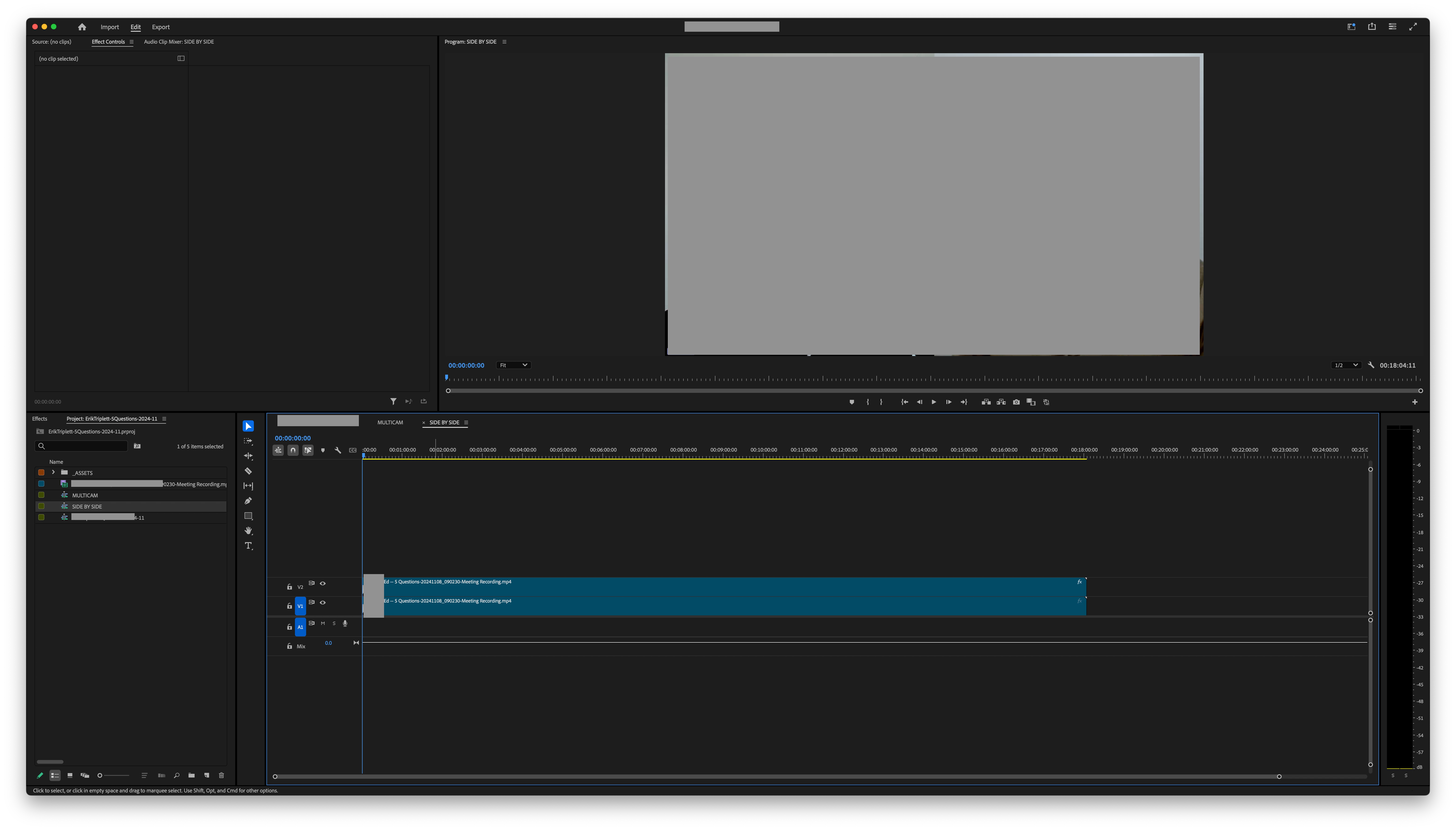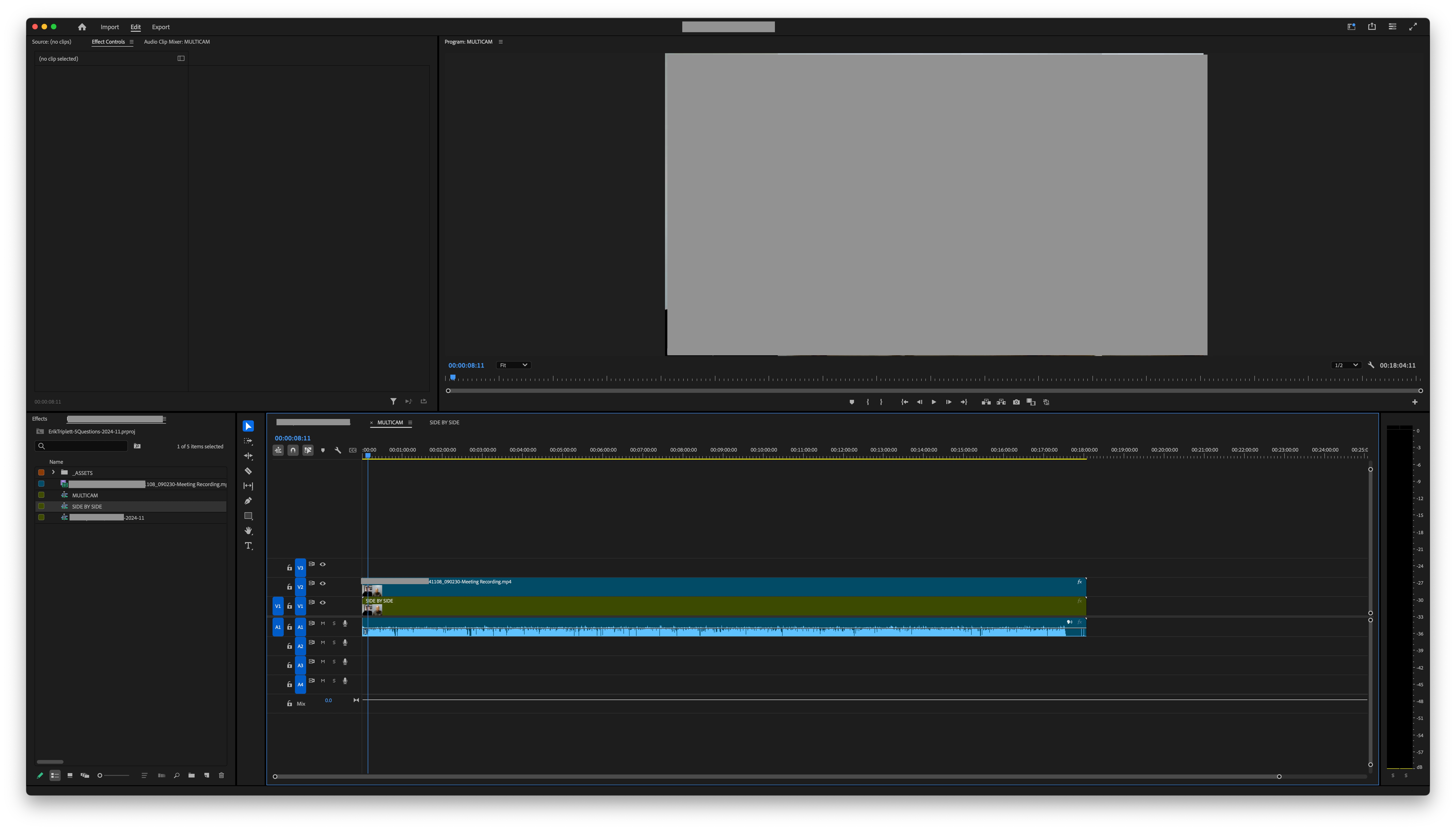 The Program Monitor is set to Multicam and I can see both video tracks.
