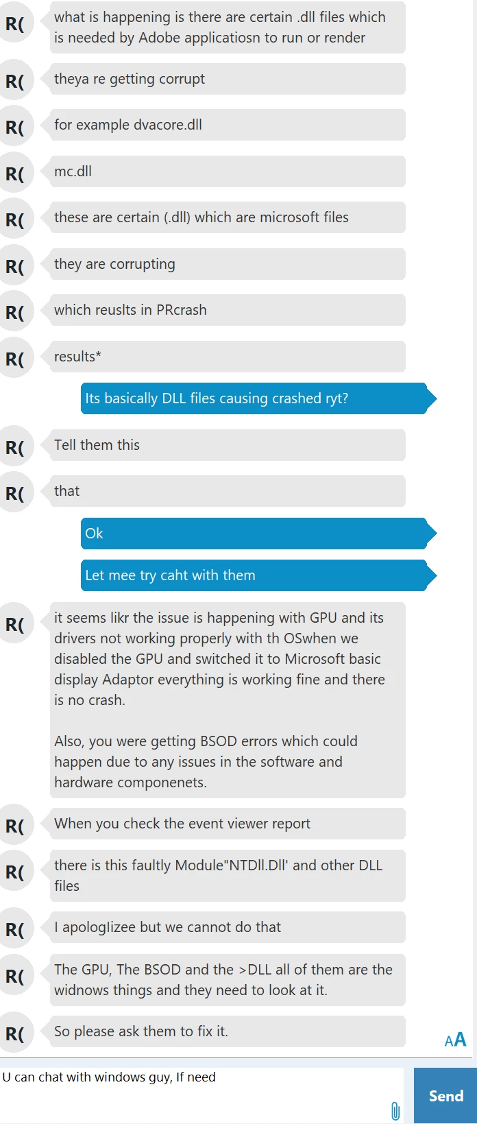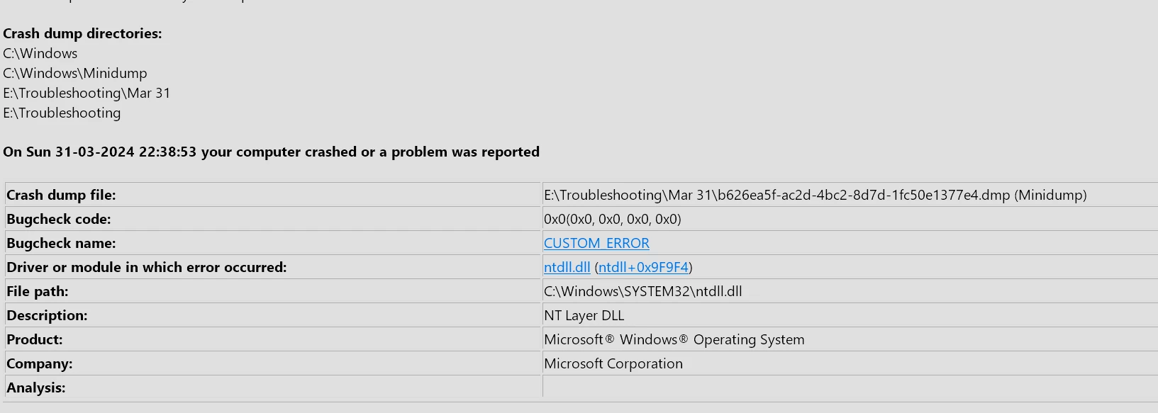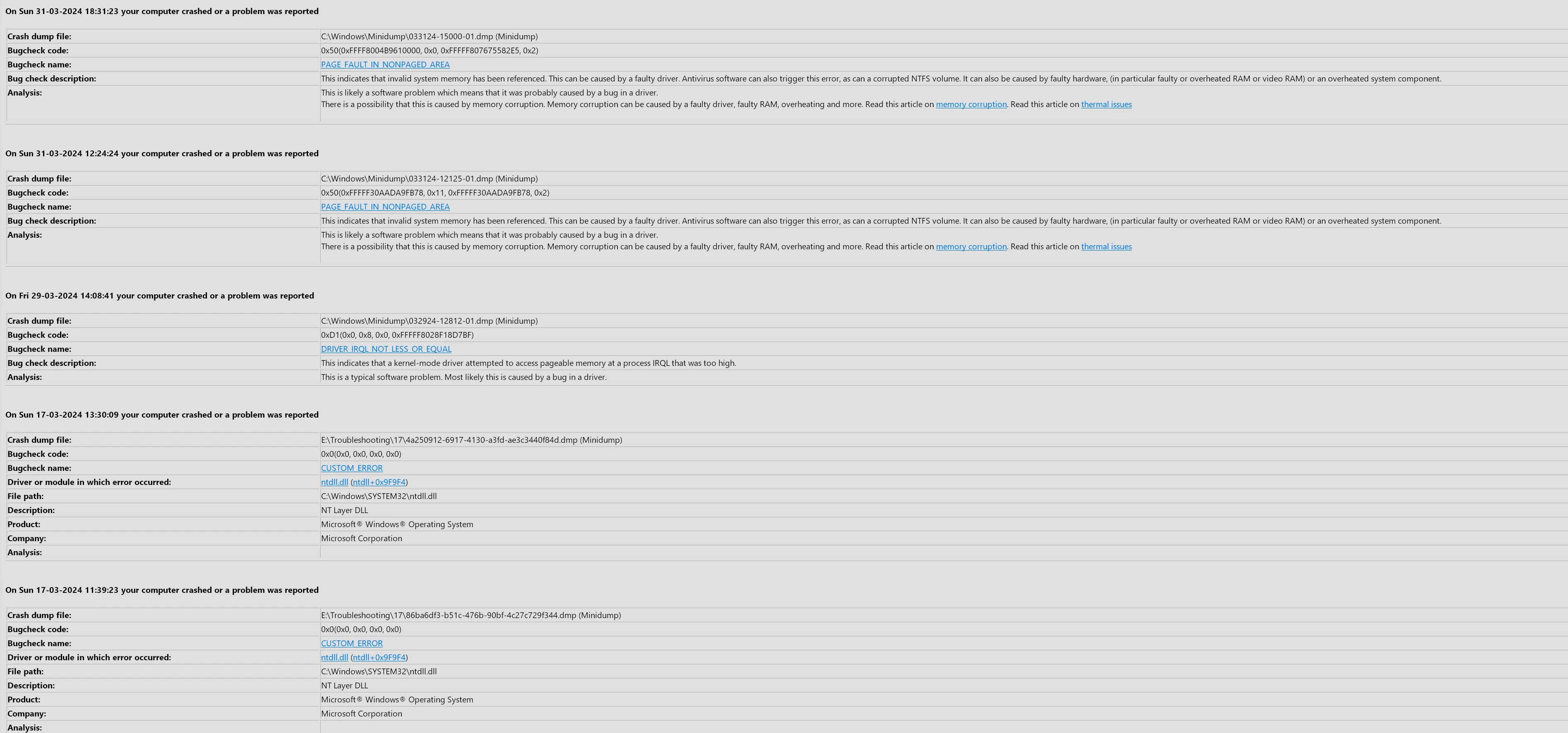 Initially, I assumed it was an issue with Adobe software and contacted their support team, but they were unable to resolve the issue after several hours. I then reached out to the Windows customer support team, and they recommended that I reinstall the Windows OS. I followed their instructions, but the applications still kept crashing. I also ran a RAM test, but no problems were found. To troubleshoot further, I downgraded my new GPU with an old one (3060), and it helped me to open the application initially rather than crashing whenever it tried to open. Although it was a small improvement, it was still unstable. I updated the MSI bios, turned off XMP, but the crashes persisted. Even if I tried to edit a new project, the software just kept crashing. After browsing some forums, I found that my home power might be causing these crashes if it's not sufficient since I am powering three monitors and the CPU from one socket in my home. So I connected my CPU to a separate 20 AMP port, and this almost reduced crashes to 80%. However, these crashes are still occurring regularly. I decided to try editing with different software, so I attempted to use DaVinci Resolve, but it also kept crashing. I have already sent my 4080 for warranty check just to see if the GPU had any faults. I ran a RAM test twice, and no issues were found. I spent several hours with Adobe and Windows customer care, but it didn't help at all. I tried to stress test both the GPU and CPU for a longer time to check if the crashing was happening, but it was stable. No problems at all. Whenever I started with Adobe, the problem occurred. I did a clean installation of both Intel and Nvidia drivers at least 25 times, but it didn't help. When checking some dump files for software that crashed, I found out that the issue was happening with the ntdll.dll file. But I'm not able to fix that either. The BSODs are coming with PAGE_FAULT_IN_NONPAGED_AREA error.