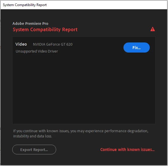 What am I getting this error on Premier Pro startup? NVDIA GeForce GT 620 - Unsupported Video Driver.