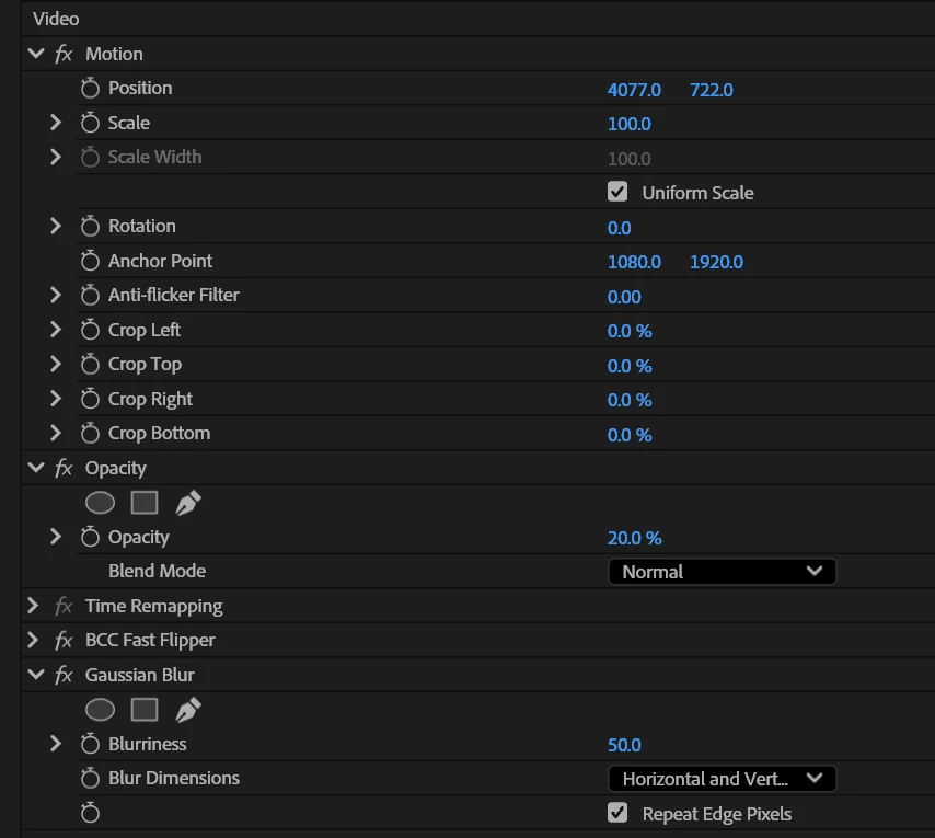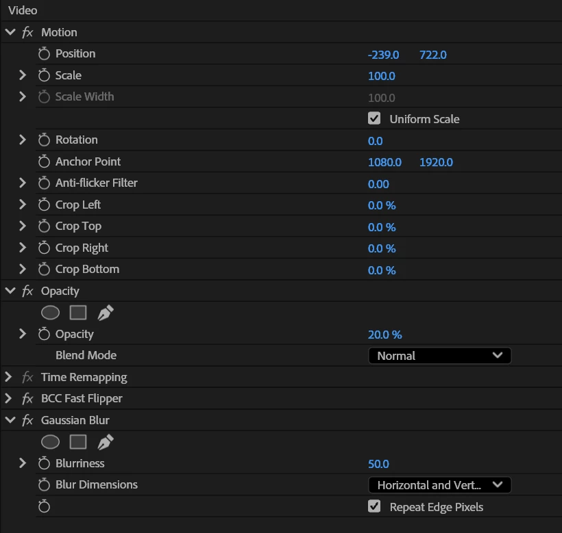 I have found a bug in the opacity of clips. I have the same clip being stacked three layers deap, intent is to use a 9x16 in a 16x9 video frame. I have the main video in Track V1, and in Track V2 I have a mirrored video, that I apply a blur and reduce the opacity to 20% to fill the rest of the screen.