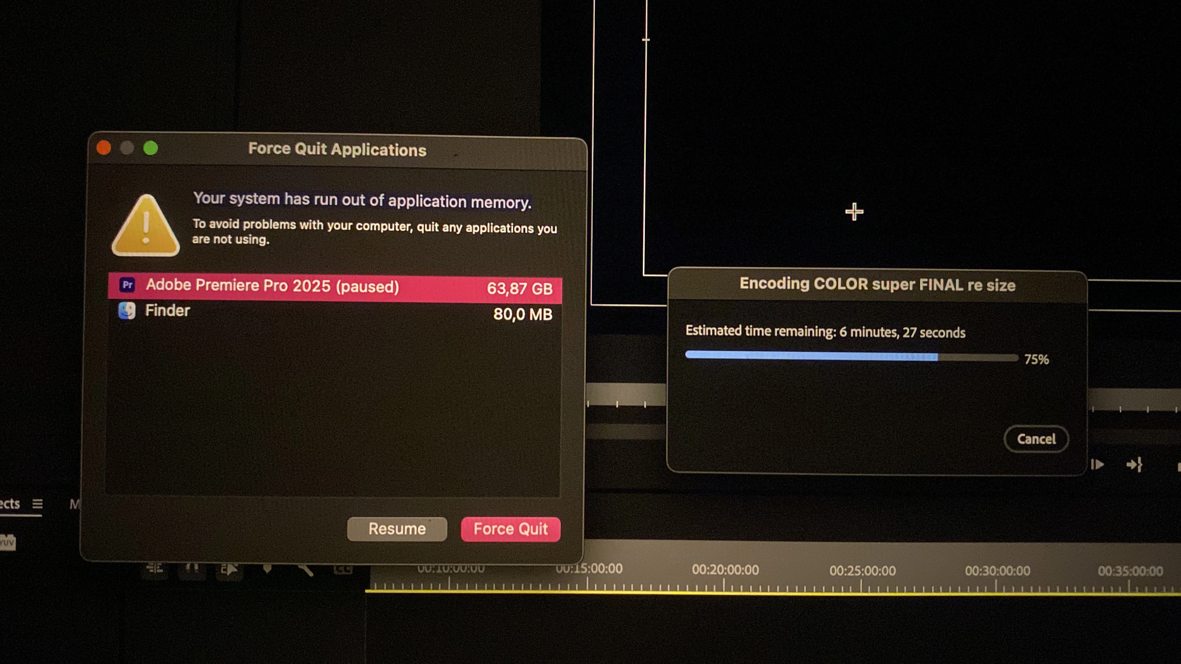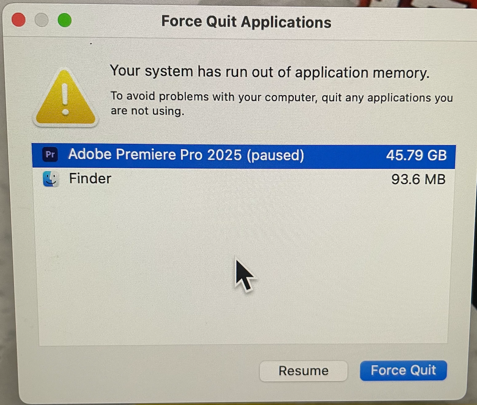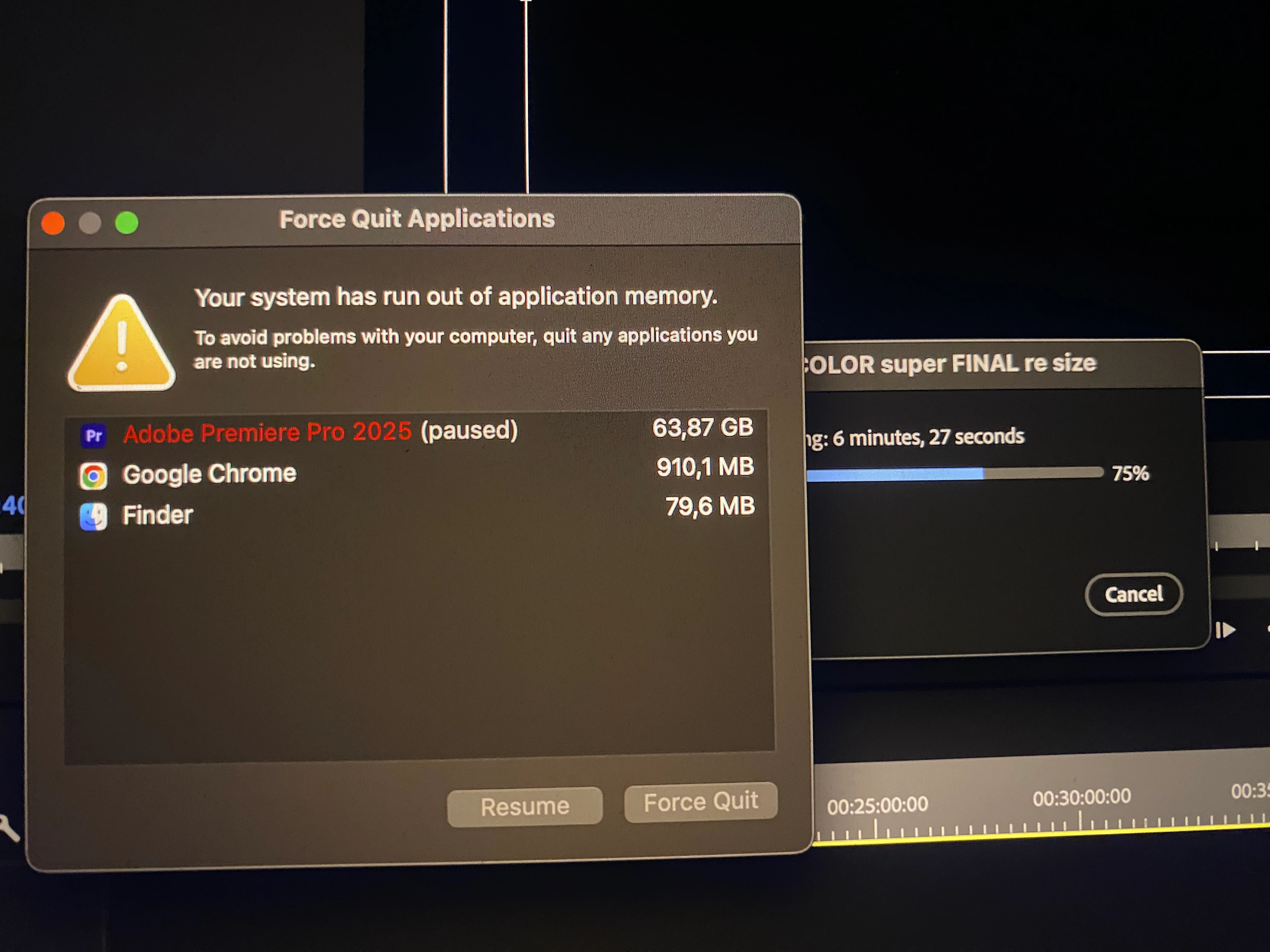 Out of Application Memory (Premiere Pro 2025, version 25.4.0)