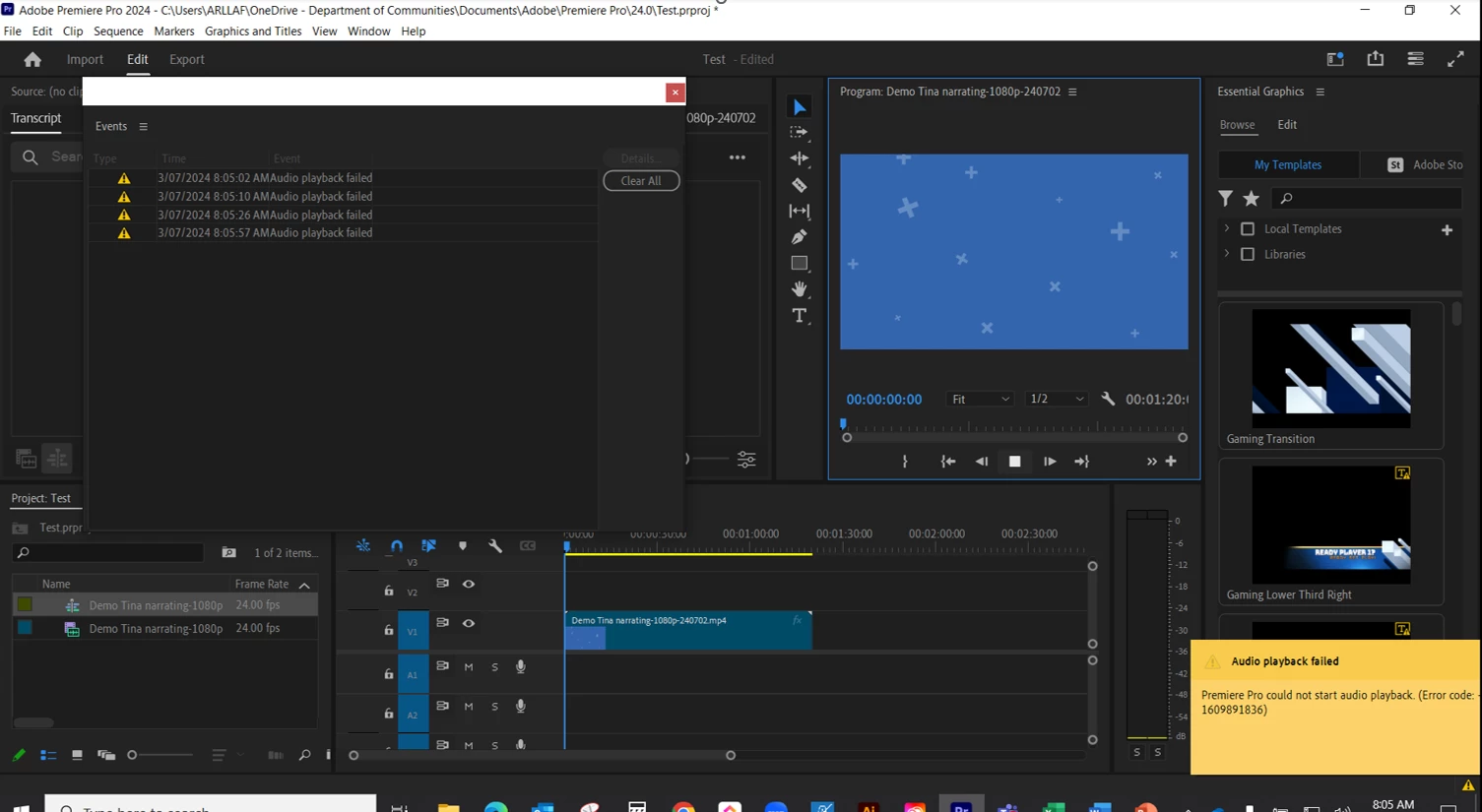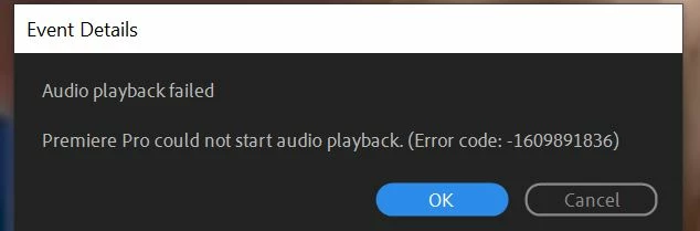 Any video I upload gets the 'audio playback failed' error message (and says Premiere Pro could not start audio playback errror code 1609891836) when you click play. The app doesn't recognise audio in any of my videos and wouldn't even play. Please see attached image. Can you please help me troubleshoot?