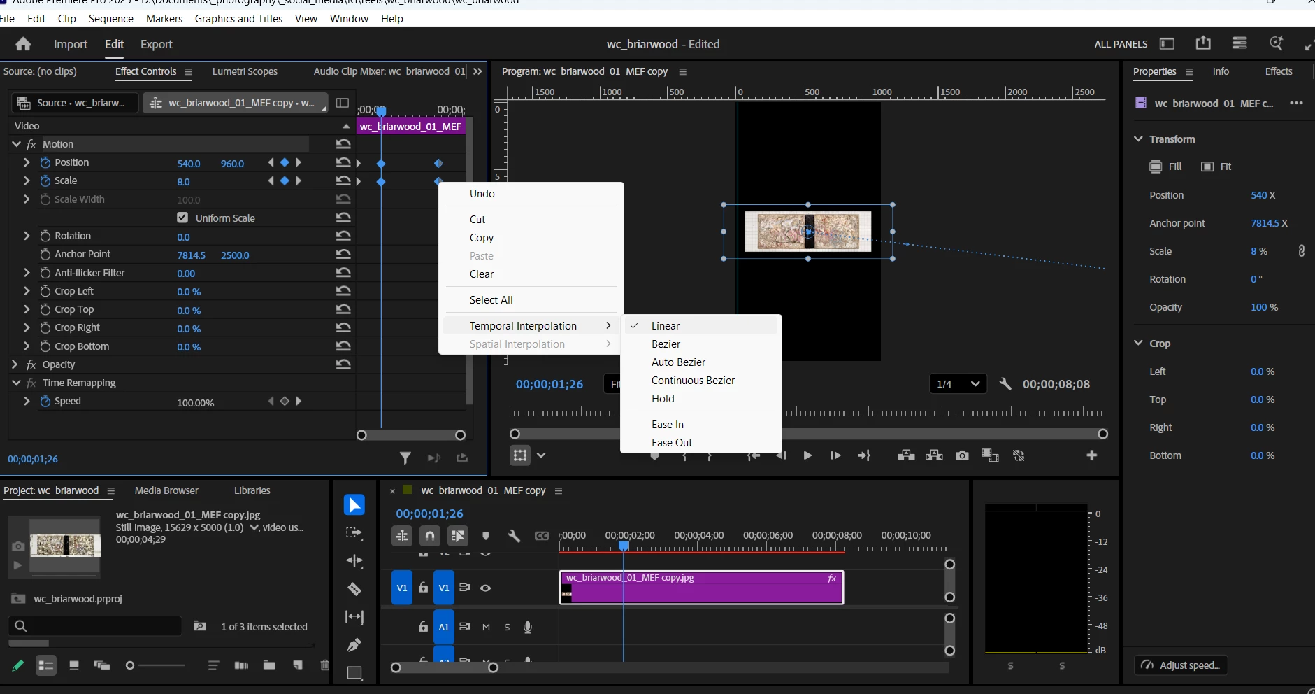 I want a pan to have a constant rate of speed between the 2 sets of keyframes in my animated image. I Googled it and found instructions to select the 2 sets of keyframes by dragging a selection box around them, then right-click on one of the keyframes and select Linear in the Temporal Interpolation option. Its still slowing down towards the end, much faster at the beginning. I've attached a screen shot but I don't know if it shows anything helpful. Any help would be appreciated. Thank you.