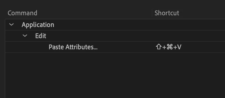 Hi, I'm on 23.5.0 and as of the previous update to Premiere, my custom shortcut for Paste Attributes isn't working anymore. My shortcut is Shift + Command + V and instead of pasting attributes, it paste-inserts instead, which I have mapped to Shift + V (screenshots attached). It's weird because when I select the Paste Attributes command under the Edit menu, it shows no shortcut icons next to it, but under keyboard settings, it's there. I have removed the shortcut and put it back and same situation. Things like this usually resolve after an update, but I just noticed a new version and it's the same.