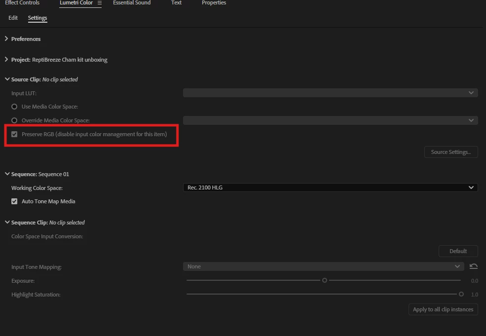 Go to Lumetri Colour > settings > source clip > tick preserve RGB (disable colour management for this item)