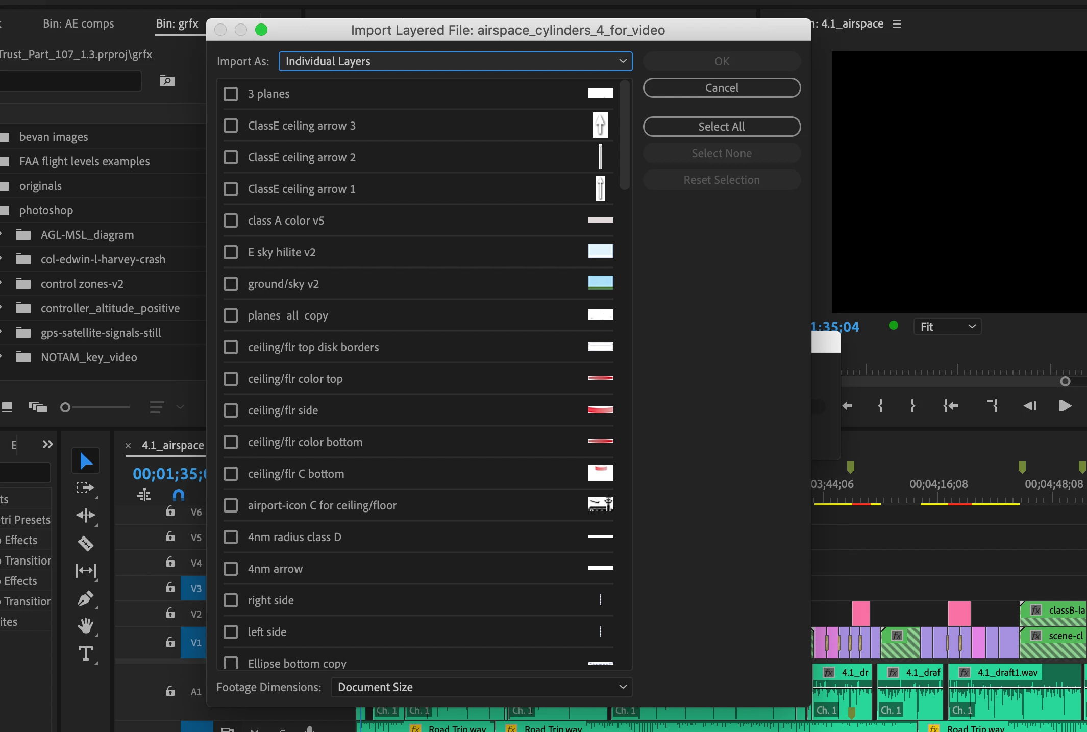 Thanks for the reply. I did not merge the layers. You can see them in the screen shot. Only those layers past a certain number down the list of layers show up in the import dialog. Replace clip only works with clips that are already in the project, and open in the source window.
