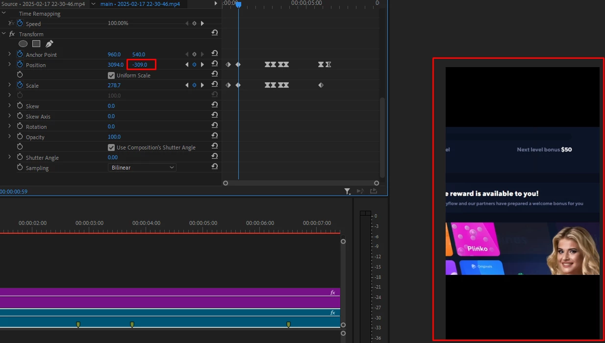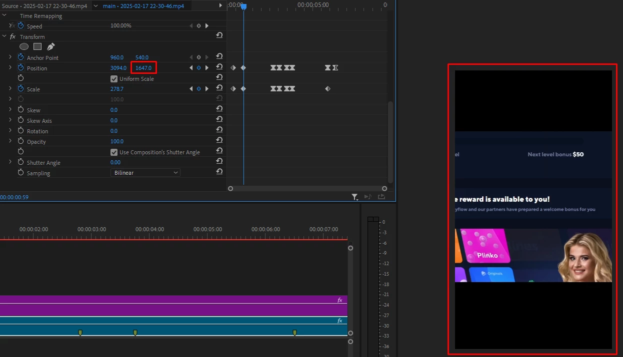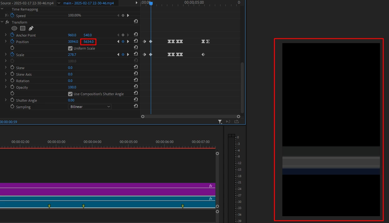 I have a screen record. Use the mask to cut out the required area. Then add Transform. And when animating the position parameter the following happens - there are “dead zones” that have borders, changing position in which nothing happens at all. The frame just stands still. And if you still go beyond this dead zone, the value is very large and the animation turns out wrong. What is the problem and how to fix it?