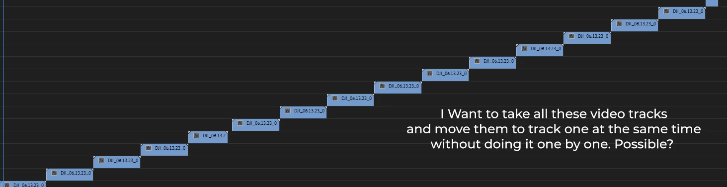 I have multiple video layers. I need to move all the video clips onto one track. is there a shortcut to do this as they are stacked pretty high? Please see attached photo