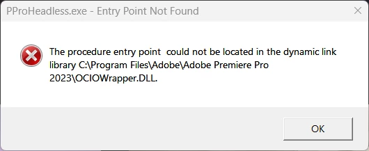 The procedure entry point could not be located in the dynamic link library C:\Program Files\ Adobe\Adobe Premiere Pro 2023\OCIOWrapper.dll