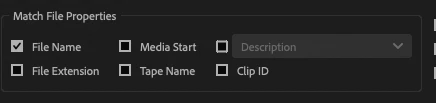 Thank you!  This solved the exact problem I was having too.  Unticking the File Extension box under Match File Properties let it find all of the other clips too - honestly thought I was about to sit for half an hour matching each one!