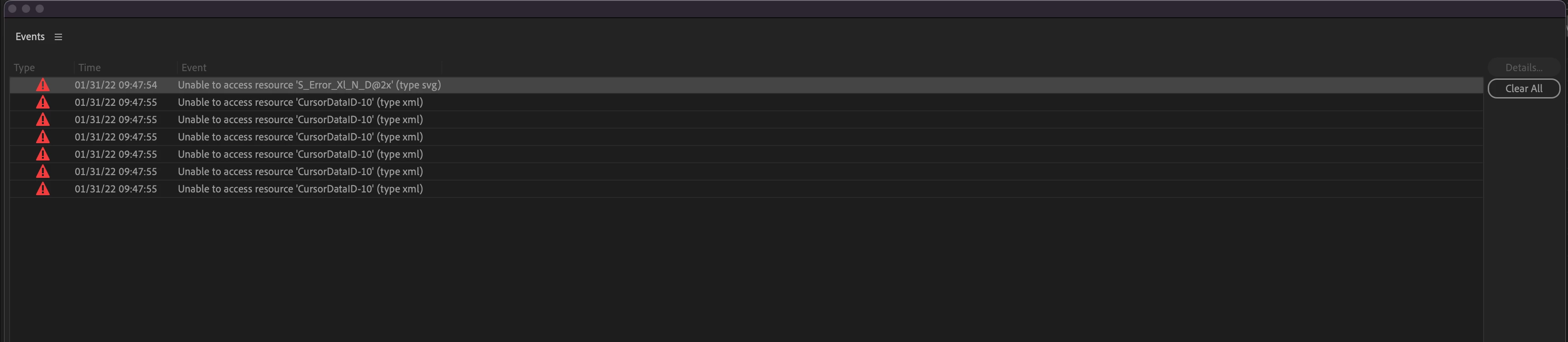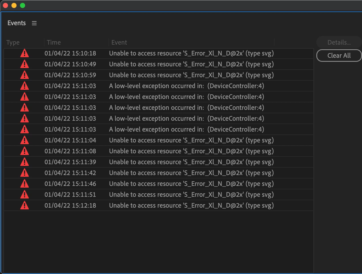 After having no issues with 15.2 on small projects, Premiere became completely unusable after about a month of working on a feature film. It really seemed like an access error, as I'd get errors like "Unable to access resource 'S_ErrorXl_N_D@2x' (type svg)," "Error Retrieving frame XXXX at time XX," and "Unable to access resource 'CursorDataID-19 (type xml)." The errors came with frozen or black video, I could still hear audio, and it usually fixed itself after about 10-20 seconds. I also couldn't export anything no matter which renderer I used. I thought it had something to do with Canon MXFs, since those have always been problematic for Premiere, but I got the same errors on ProRes 422, HQ and 4444 clips as well. The issues happened about once a day at first, and gradually increased to once every minute. At that point we shut down editorial until we figured this out.