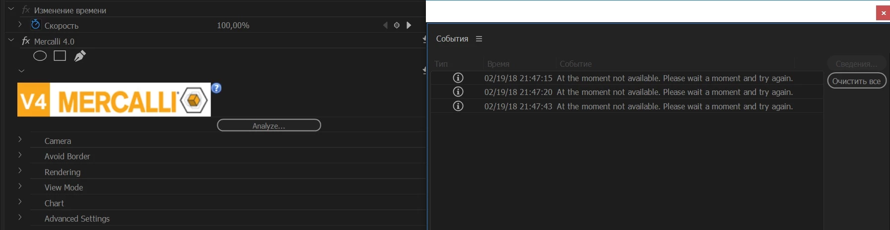 Hello, I can not process the video with Mercalli in the premiere. Premiere say:" At the moment not available please wait a moment and try again". Tried to reinstall - unsuccessfully. I tried to change the settings of frames in the project - unsuccunsuccessfully. I tried to change the settings of frames in the project - unsuccessfully.