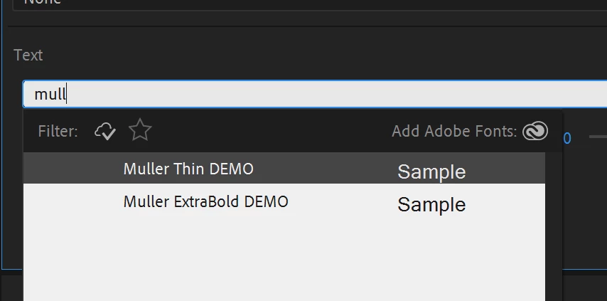 First picture of After Effects with Muller font installed, but Premiere doesn't show all family font, can someone help me? I ALREADY installed twice, uninstalled, put the folder into adobe common files, didnt work.