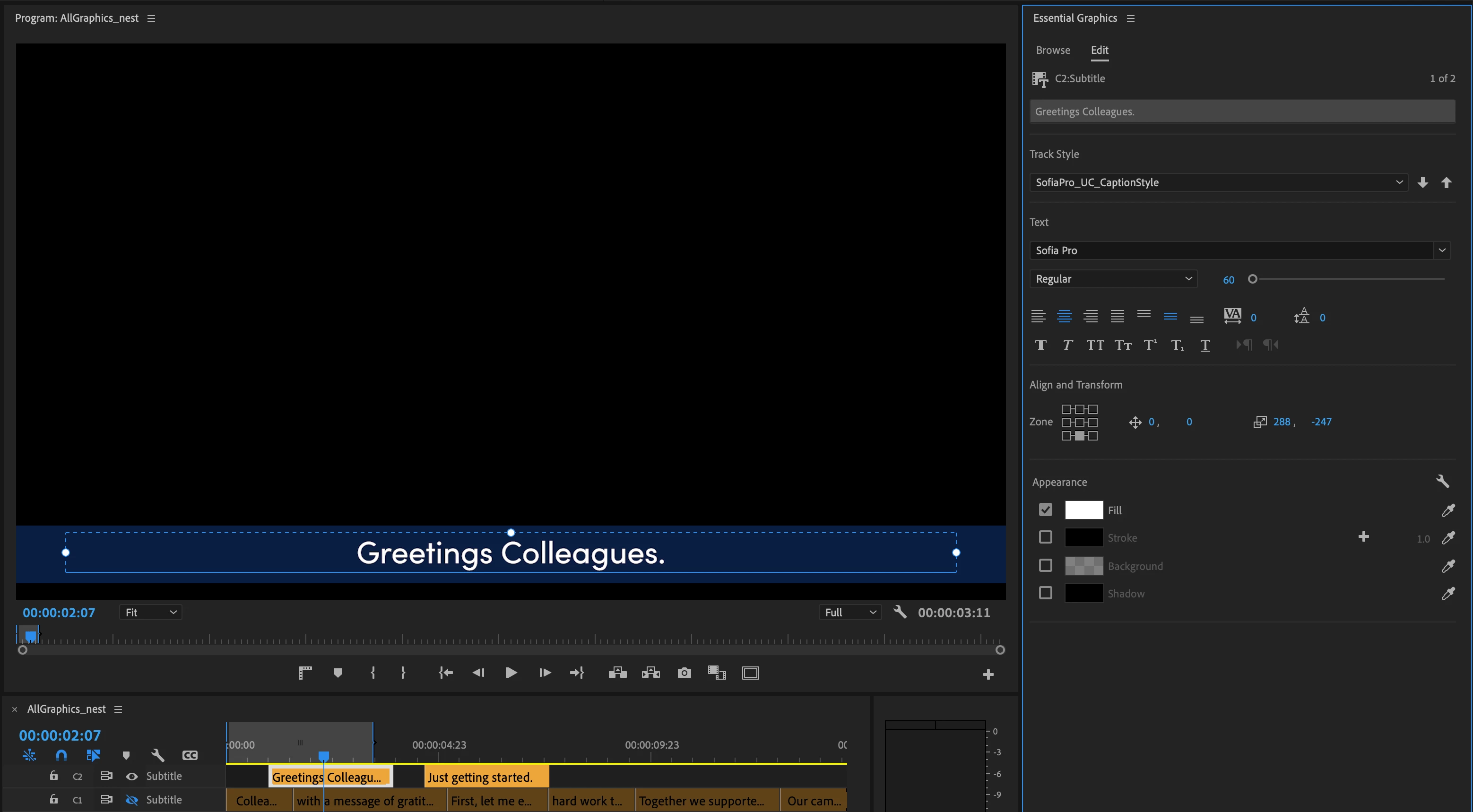 My original state: I had Sofia Pro Regular size 60, *bottom align text*, centered but bumped up by -16p vetically and I made the caption box as wide as I could for longer phrases.