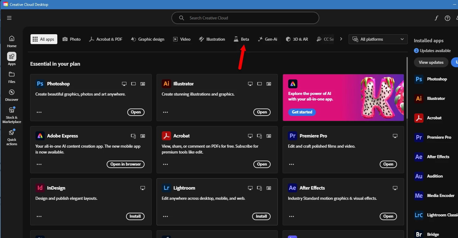 I'm wondering if your Creative Cloud Desktop is uptodate. I see you don't have the Beta category on the top row: