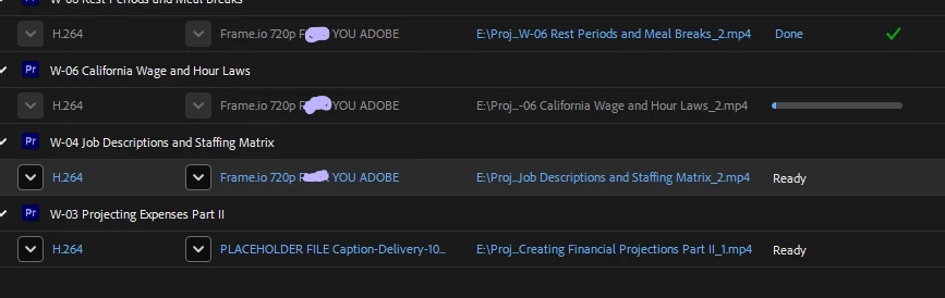 1. The video exports black randomly and there is no rhyme or reason. As you focus on the version numbers in the following image taken from Frame.io. The version numbers are strictly from videos being exported with either black video, or from the wrong video being exported as you will see later. So some videos took minimum 4 tries to export. This has litterally taken me over 14 hours+ to figure out and get these videos exported and loaded to vimeo. This is unacceptable ADOBE! And this is just the beginning of export problems with Adobe Premiere Pro 2023.