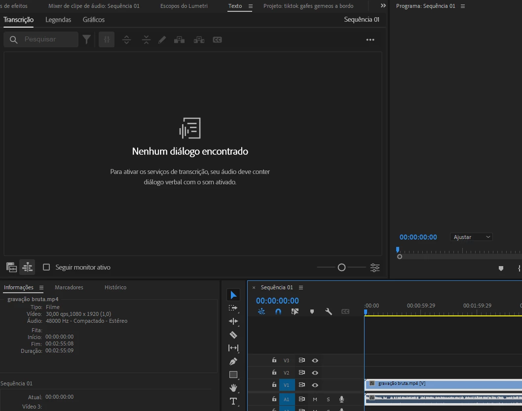 Coloco o vídeo na sequência, vou em "Texto" para transcrever (PT-BR), faz todo o processo de carregamento, mas no final aparece "Nenhum diálogo encontrado."