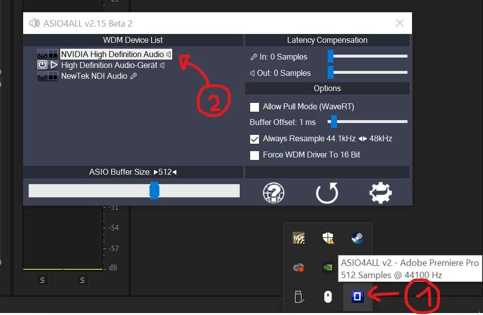 4. If no sound is played back to to the taskbar (hidden applications) and double click the now visible ASIO4ALL Icon (only visible when Audio is played via Premiere)