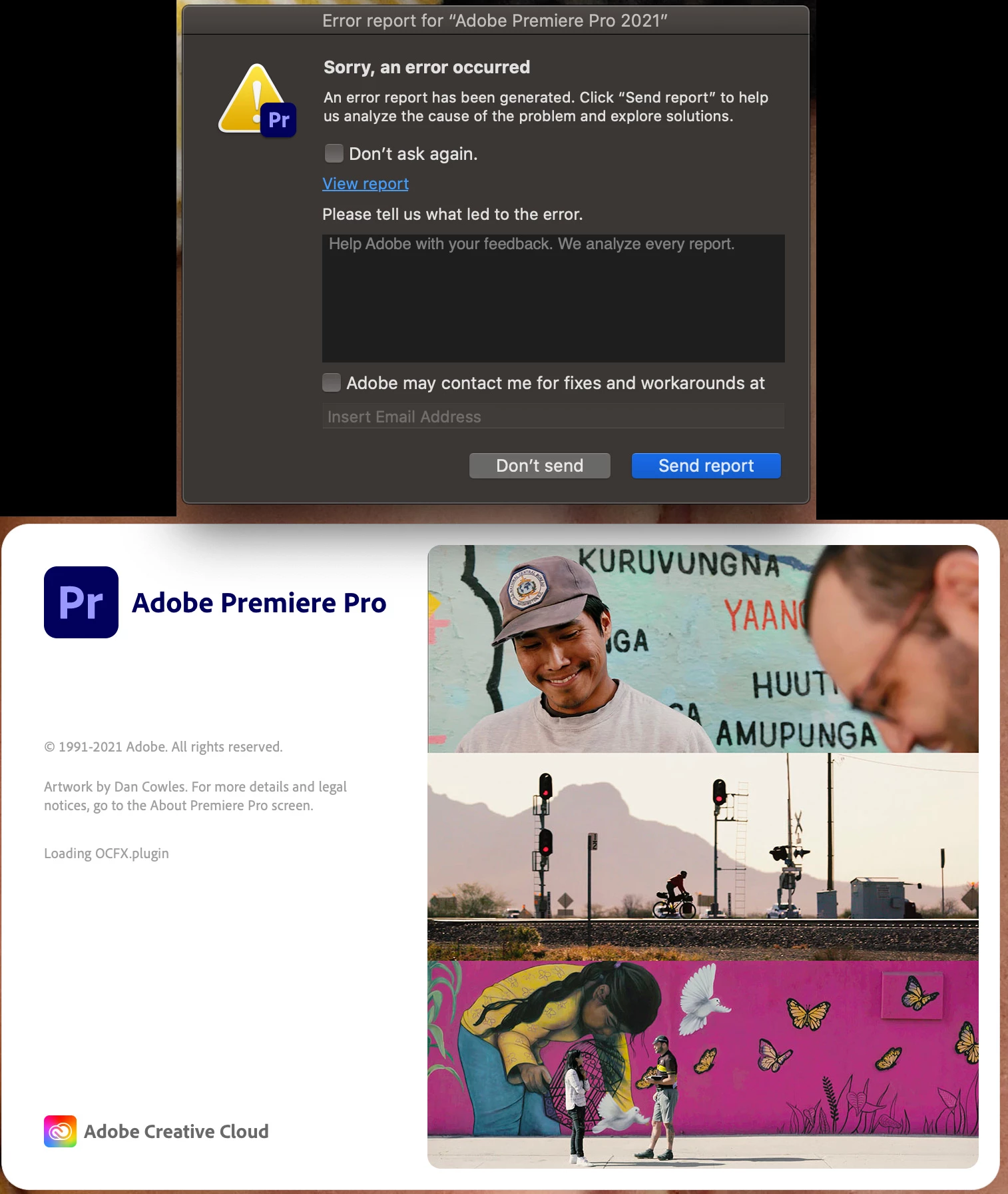 For the past few weeks Premiere Pro does not get past the startup screen on my Mac. I'm using the latest version of Premiere Pro and Mac OS 10.15.7 (Catalina). The error box pops up while it's "Loading OCFX plugin" (that's what the splash loading image says) and the error box itself says "Error report for 'Adobe Premiere Pro 2021'" . . . . "Sorry, an error orccured" and then has generic report / submission instructions. The "view report" link doesn't work, of course. And all submissions to have Adobe contact me have been fruitless. This is quite frustrating. My other apps from the Adobe Creative Cloud work just fine. Other tutorials on how to fix this have not worked. Any help is appreciated.