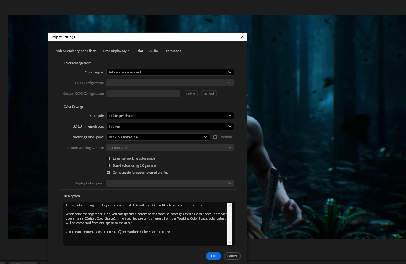 À chaque fois que j’envoie une séquence de Premiere Pro vers After Effects, les couleurs apparaissent nettement plus sombres. Pour retrouver un rendu correct, je suis obligé d’aller manuellement dans After Effects → Paramètres du projet → Gestion des couleurs et de régler l’espace colorimétrique de travail sur “Aucun (None)”.