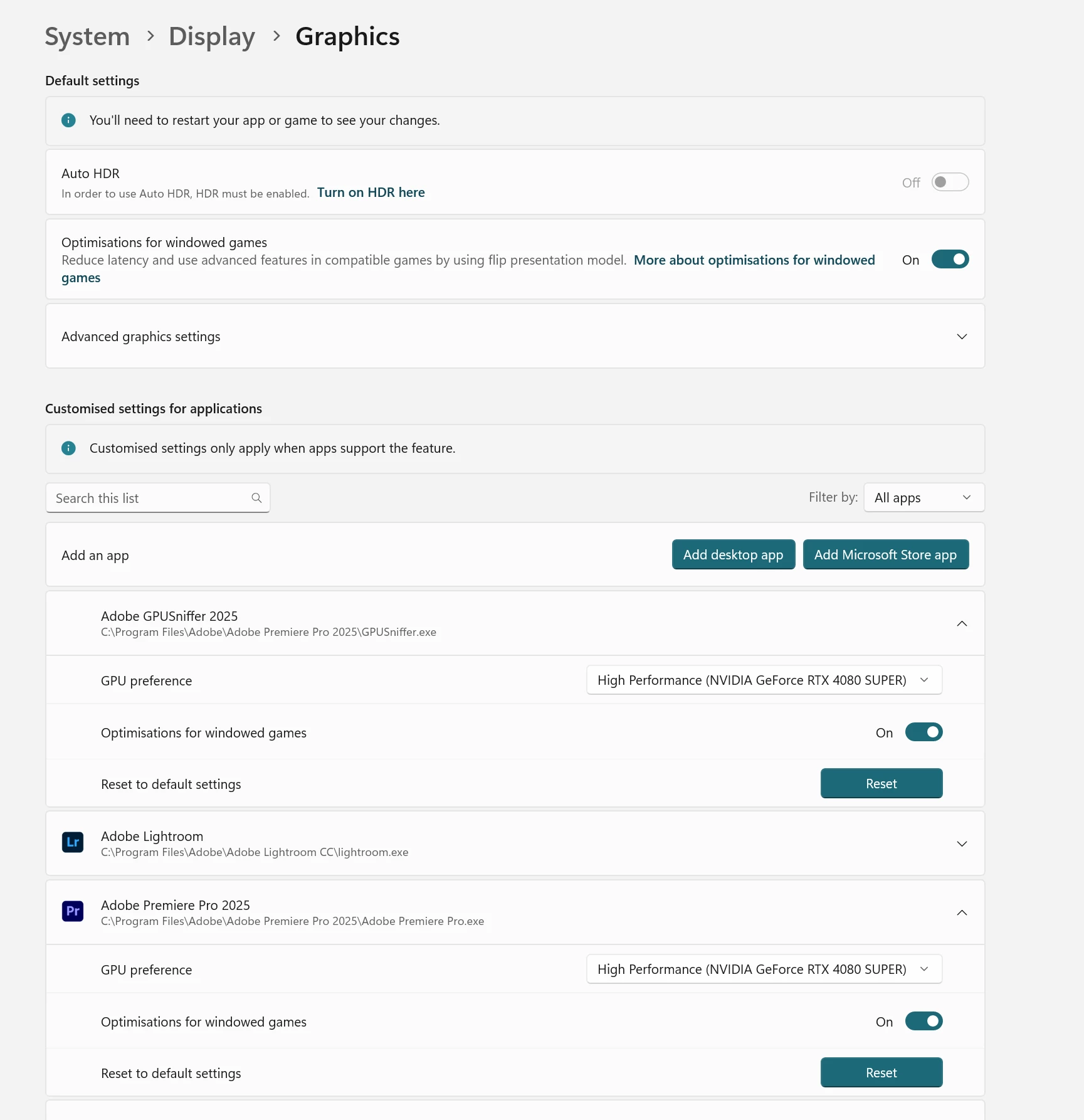 Final bit is info that Thomas Yang of Adobe gave for people with blank screens on Laptops. Not your issue I know, but it is a tip to ensure Premiere is selecting NVidia as the preference GPU and also the Adobe GPUsniffer.exe programme is set to NVidia as priority with High Performance setting. GPUsniffer can be set to Windows making the preference - so ensure you force it to Premiere Pro.