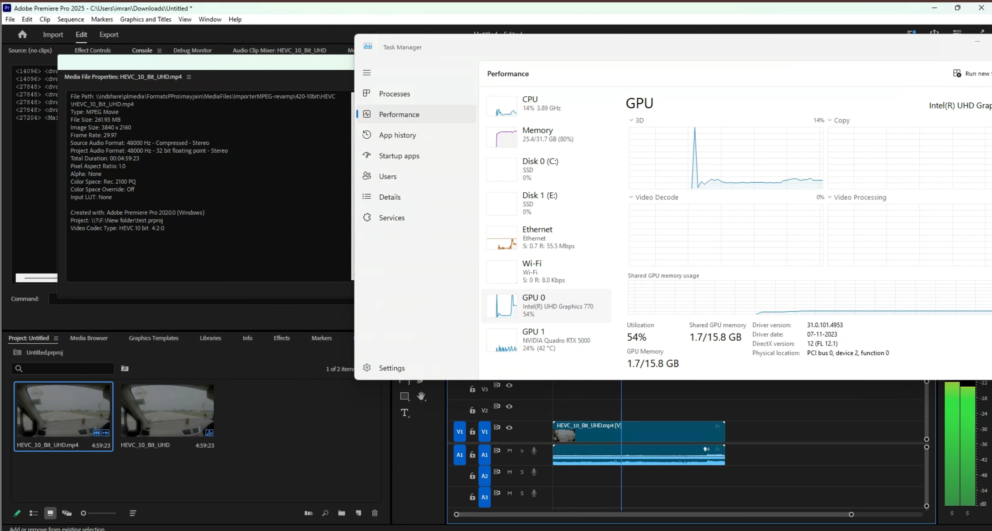 It's a HEVC 10 bit 4:2:0  which is decoded but Premiere Pro shows I have no Intel iGPU installed and the decoding is done by the software, not a hardware decoding. One might think there's a problem with my iGPU, it's dead or something.