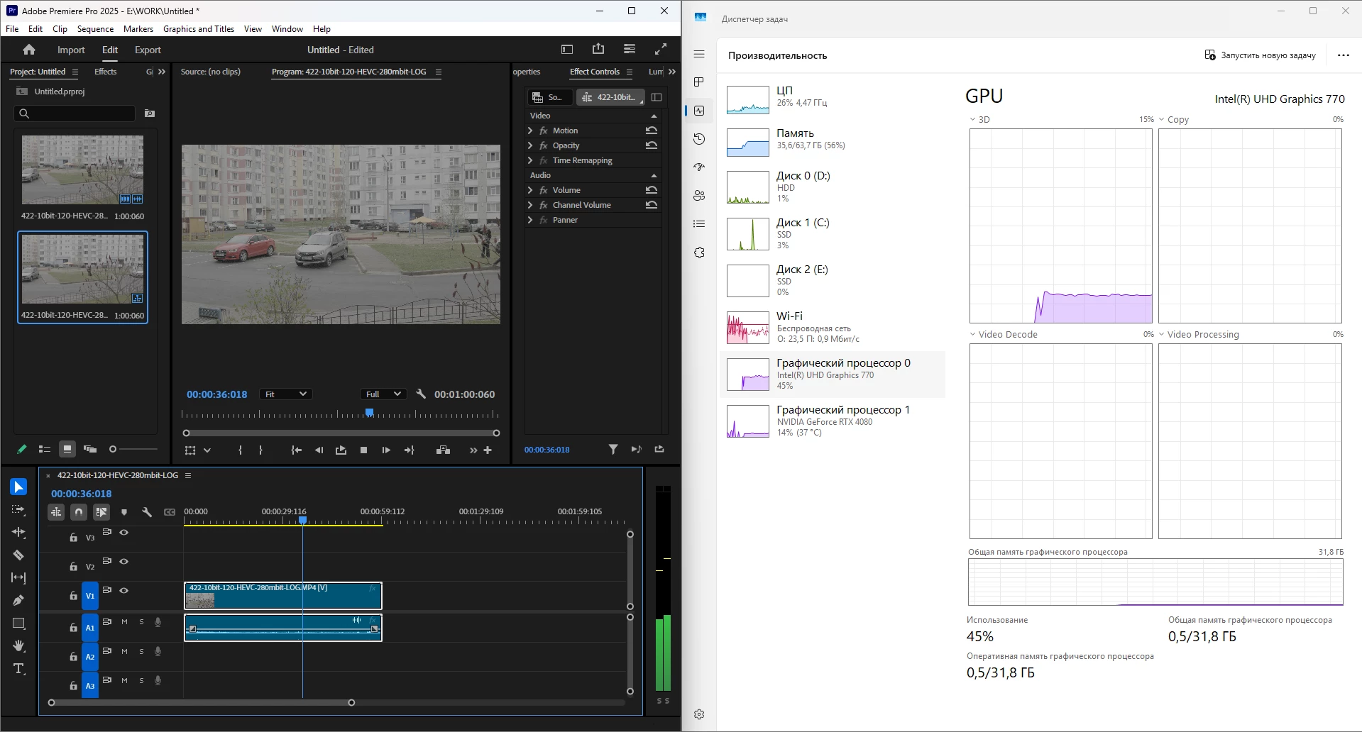 Now why is this all iGPU thing crucial, and why I even brought up this issue. Below are two videos. The first shows Premiere Pro 25.0 in Windows 11 23h2 simultaneously playing back 4 physical copies of an h265 10 bit 422 120 fps footage. You can see that my CPU's iGPU helps immensely to play that back without any visual frame drops. The CPU is only 50% loaded by the way: