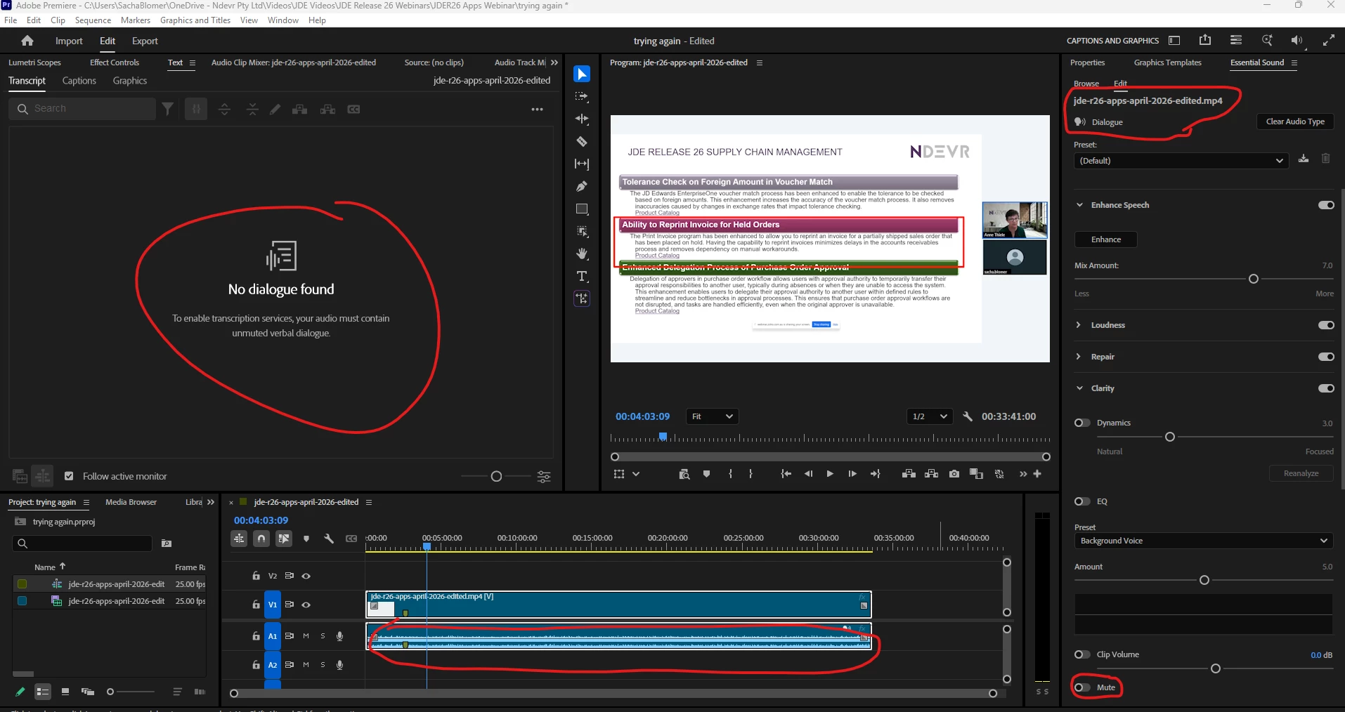 Premiere Pro 26.0 fails to transcribe audible dialogue and displays “No dialogue found”