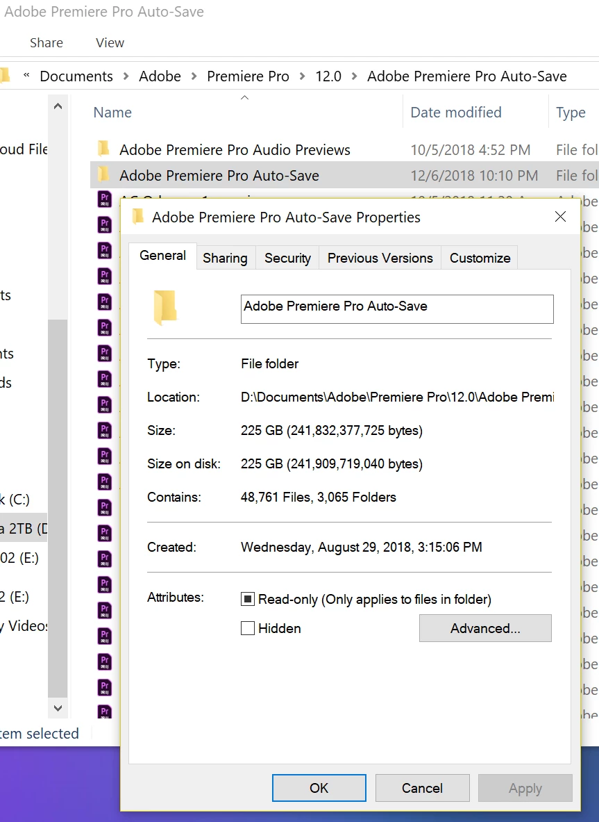 So, when I go into my premiere pro folder on my hard drive, (which isn't my C: Drive, I moved premiere over to my D:) there's a folder called "Adobe Premiere Pro Auto-Save. This folder says its over 200gb when I look at the properties, but when check the total space used for all of the contents in the folder, it doesn't even come close to that number. Are there hidden files of some sort that I can somehow delete to make space? This is very frustrating and I'm not sure if I'm just missing something.