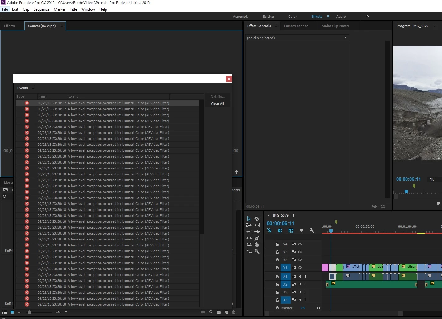 A low-level exception occurred in: Lumetri Color (AEVideoFilter)