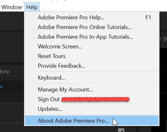 Go to Help and click on About Adobe Premiere Pro.