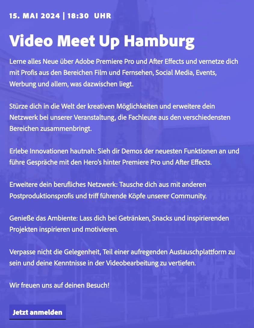 Calling all filmmakers, video editors, motion designers, and content creators in Germany! Join Adobe for a memorable night in Hamburg, Germany, on May 15, 2024 — join Team Adobe with speakers and networking opportunities all around you. Register here.