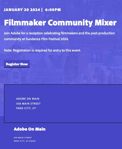 - Limited Space, Register Now: Secure your spot at Adobe's Industry Mixers by registering early. Here are registration links to the upcoming events. There are two coming up in January, 2024 in Park City, Utah during the Sundance Film Festival.