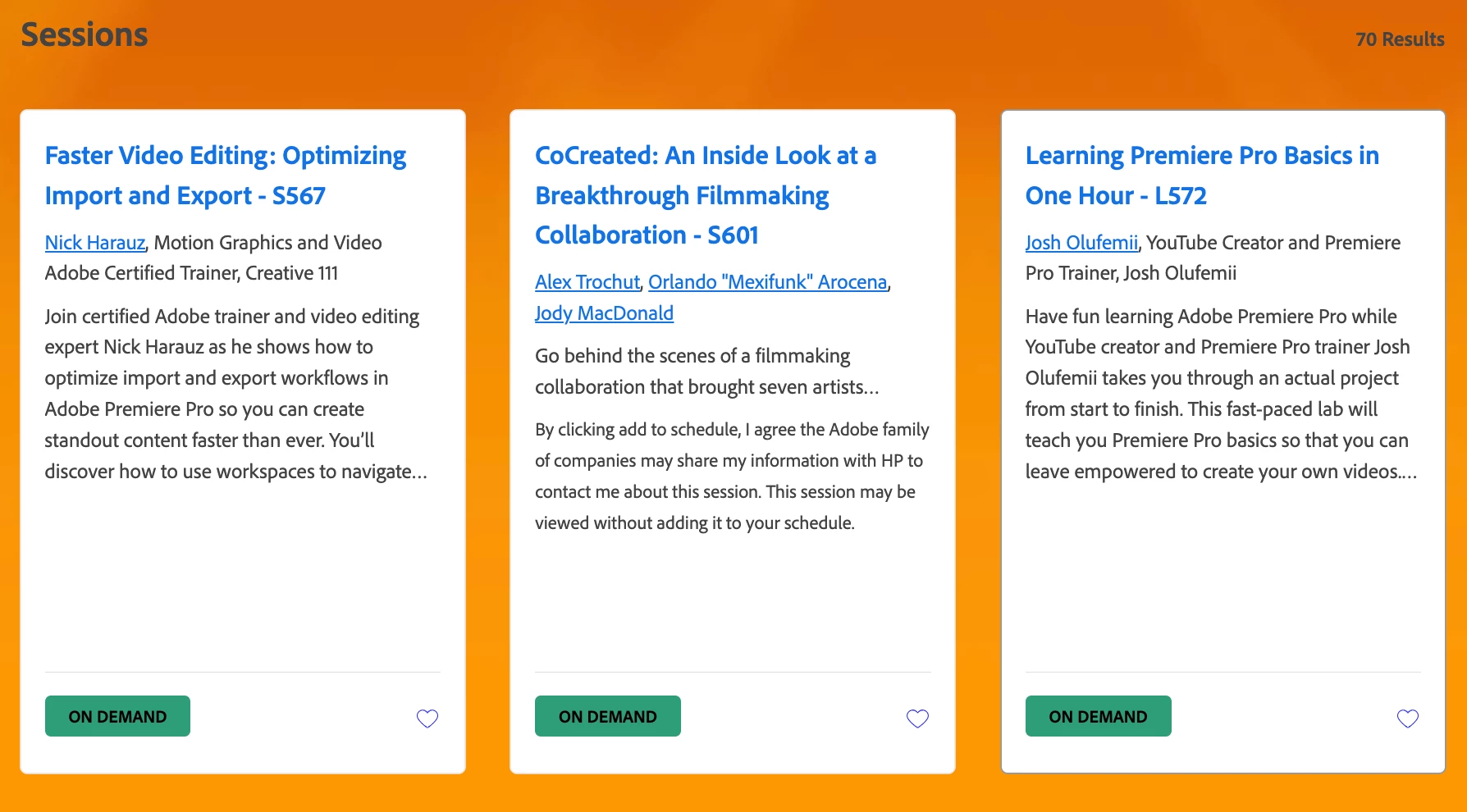 View video sessions from the conference streaming from the Adobe MAX website. See this link for seminars from the video track and Premiere Pro. Featured presenters specializing in Premiere Pro include Richard Harrington, Luisa Winters, Nick Harauz, Josh Olufemii, and Abba Shapiro.