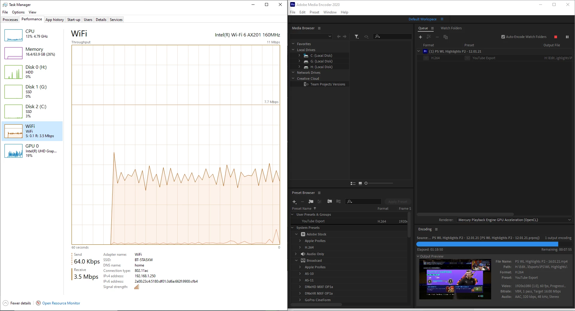One of our biggest issues is perfecting the encoding/exporting process. We have tested it across multiple powerful PC builds with top-end GPUs, at least 32GB of RAM and Intel i7 Processors. However, nothing seemed to significantly improve/worsen this process. We have noticed on 'Task Manager' that there was only small amounts of GPU utilisation (5% max), hardly any CPU or Memory utilisation, and the only real fluctuations in performance were seen across Wi-Fi/Ethernet performance.