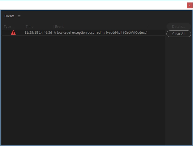 "premiere pro events a low level exception occurred in: lvcod64.dll (get avicodecs)"