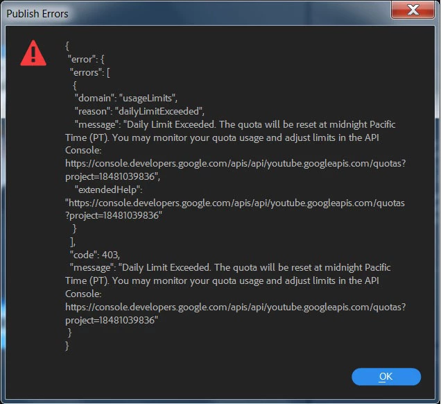 What are correct steps to export directly to YouTube? I got the following error pop-up when trying to do so [see screenshot]
