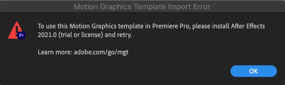 I am editing a video in Premiere Pro CC 2021 on mac OS Mojave. I'm trying to use a motion graphics template that requires After Effects. I also have After Effects CC 2021 installed but when I drop the graphic into the timeline it loads for a very long time then returns an error telling me that I need to install After Effects.