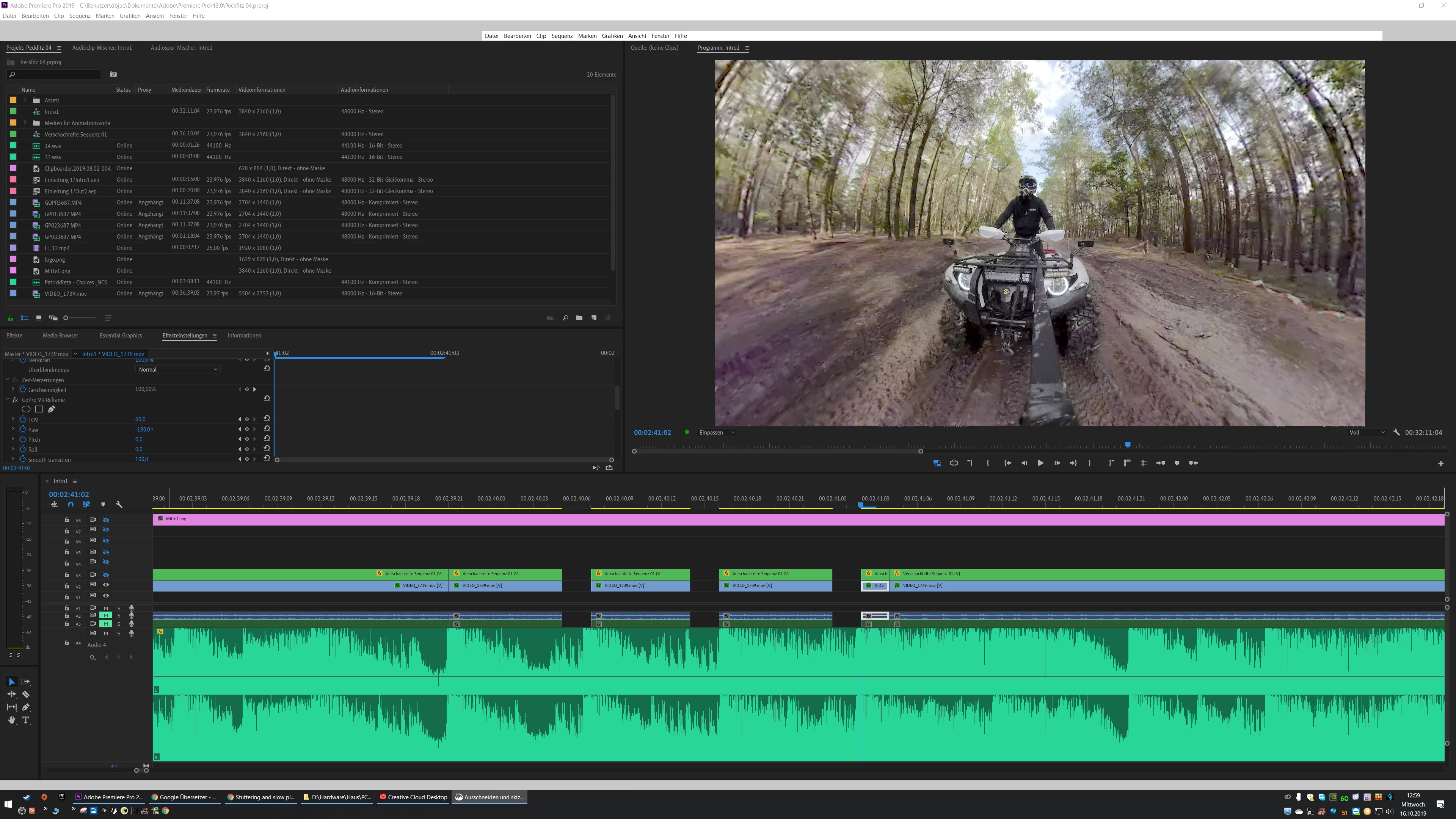 Beim Bearbeiten von 360 Grad video 5,8k sind schon in Proxy's angelegt (GoPro VR reframe) passiert es öfter dass das Programm stehen bleibt, die Fenster oder Reiter erst nach dem zweiten oder dreitem anklicken veränderbar / bearbeitbar sind. Es muss erst ein anderes Fenster angeklickt werden dass das Fenster wieder bedienbar wird, zu dem kommt das in letzter Zeit sehr oft auch dass Premiere Mitten in der Bearbeitung den Absturz Report bringt obwohl noch alles läuft Und erst nach Bestätigung des rapports erst in 20 Sekunden später abstürzt.