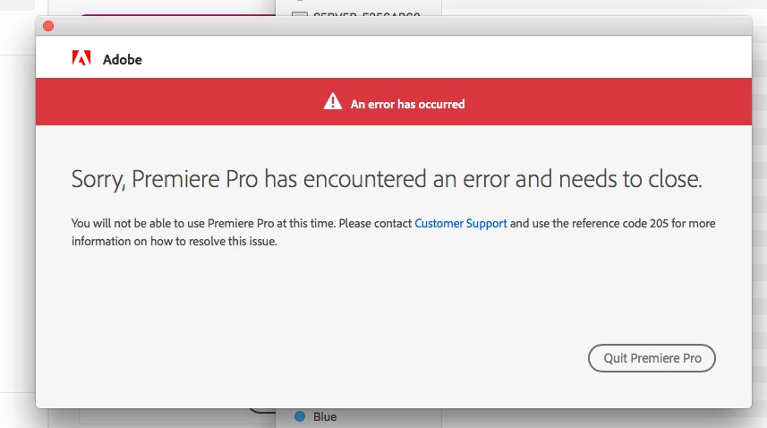 Premiere Pro keeps crashing on startup with error code 205