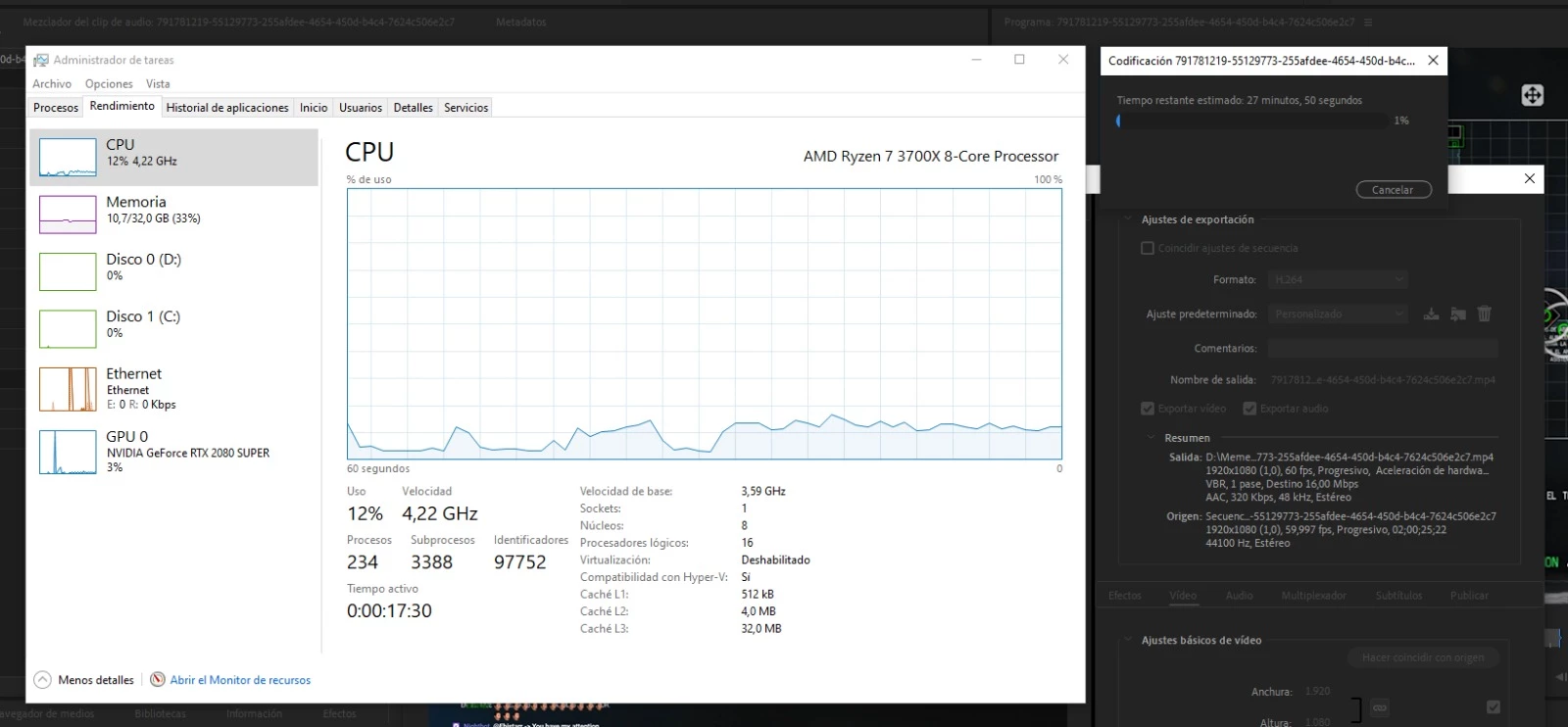 Hi everyone! Hope you can help me on this. The screenshot is from a 10 minute video export without effects or anything at 1080p 60fps (half an hour render time). Playback doesn't use the cpu either and it's VERY choppy and the export came out choppy as well. The same happens when I export via Media Encoder (even with CUDA activated). I installed Resolve and it uses the PC's full potential, either in the playback and in the export. I changed my power plan from AMD Balanced to High Performance and it worked fine for 2 minutes and then the choppy playback and the low CPU usage came back again. On a side note, Photoshop runs really bad as well, freezing constantly when I zoom in or change tools. I'm new to the forum so if you need any more info please let me know. Again, I hope you can help me, thanks.