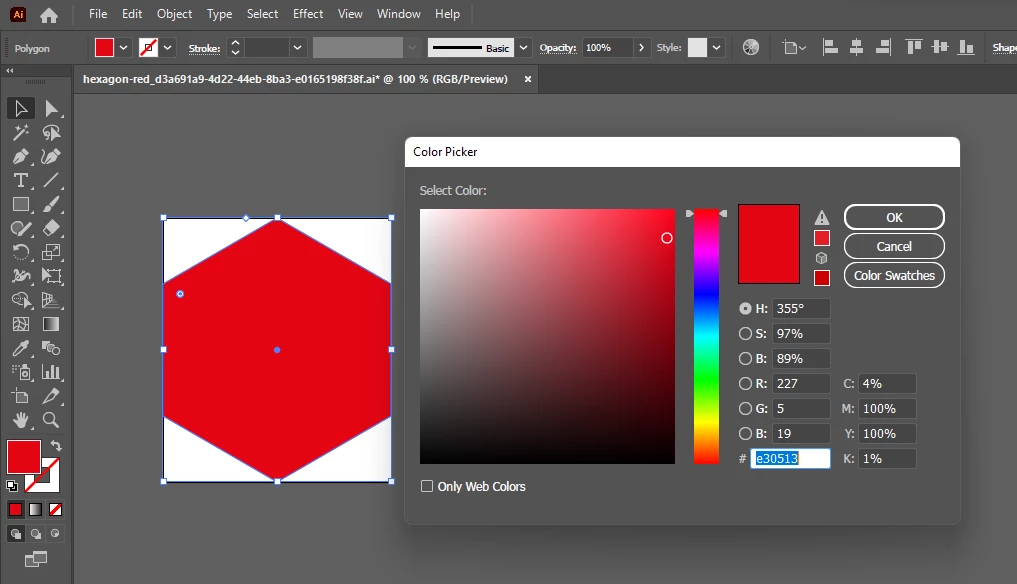 In Illustrator, I have a red hexagon filled with the color #e30513.