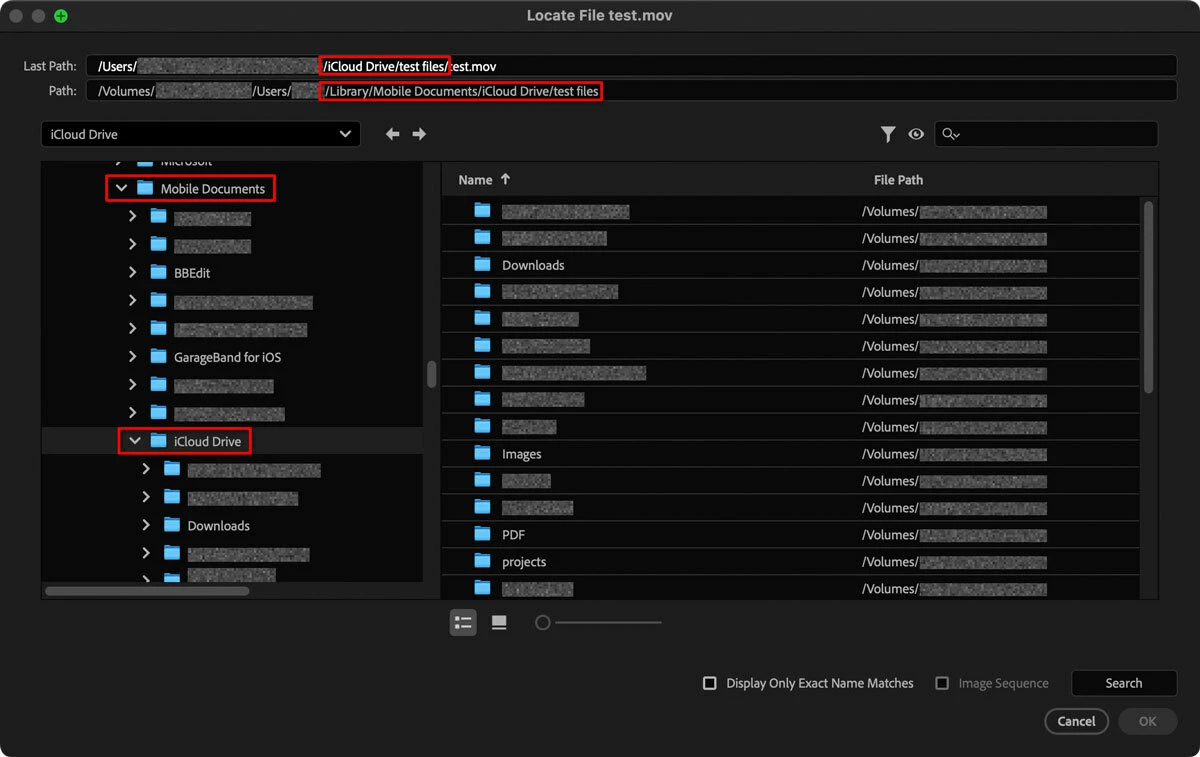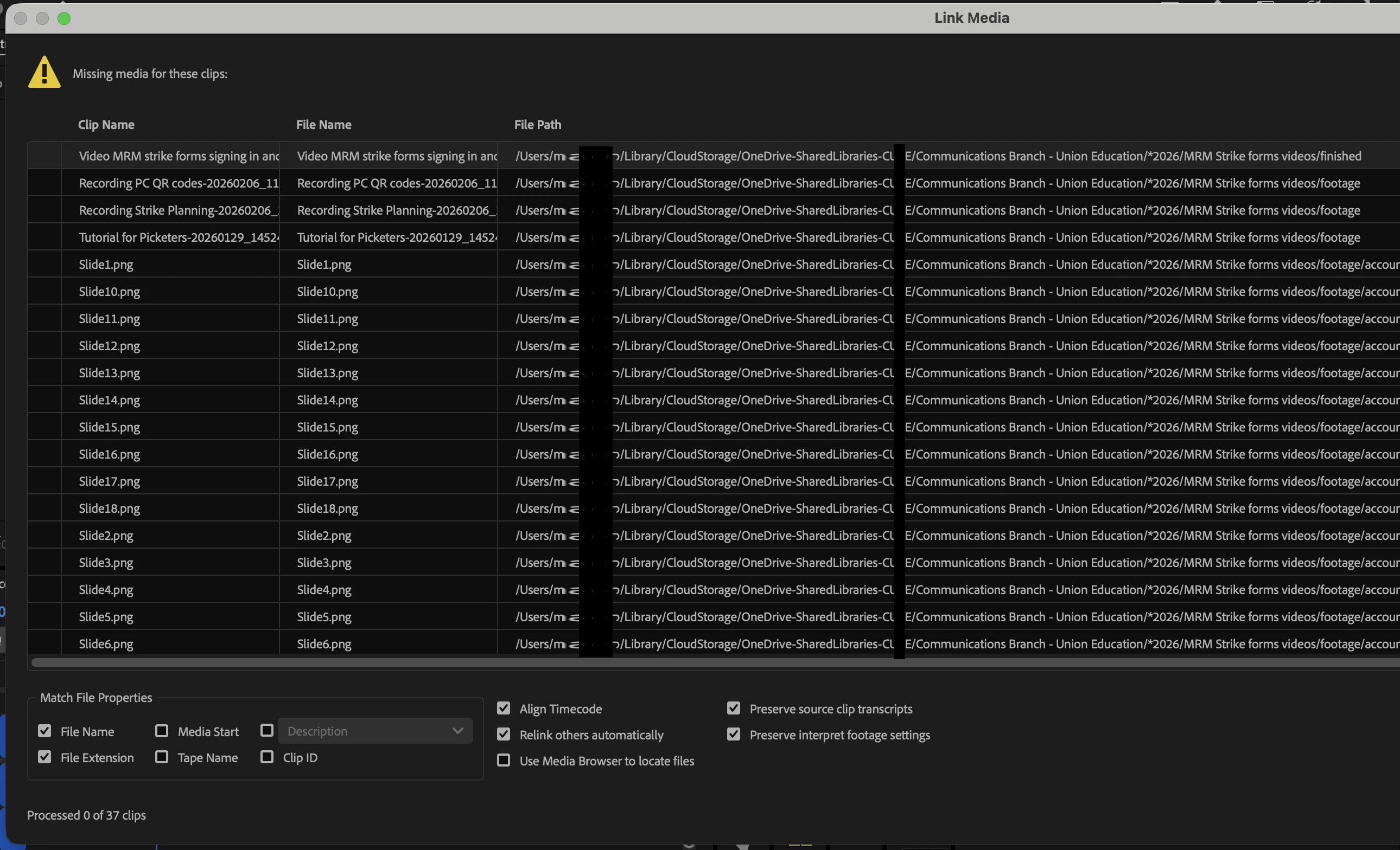 Premiere Pro's 'Link Media' panel can't access cloud storage on MacOS