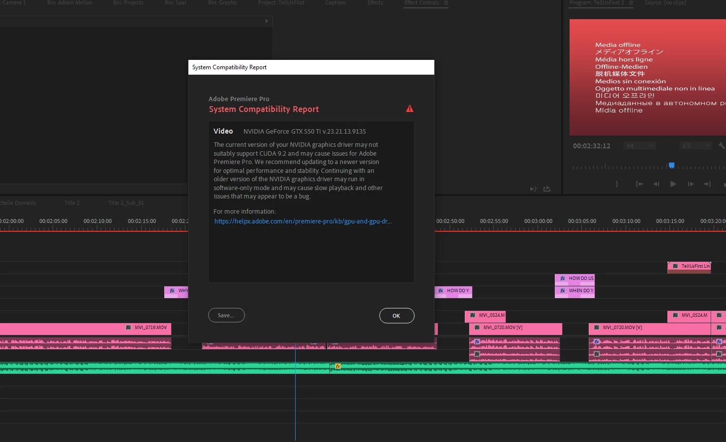 1. The current version of your NVIDIA graphics driver may not suitably support CUDA 9.2 and may cause issues for Adobe Premiere Pro. We recommend updating to a newer version for optimal performance and stability. Continuing with an older version of the NVIDIA graphics driver may run in software-only mode and may cause slow playback and other issues that may appear to be a bug.
