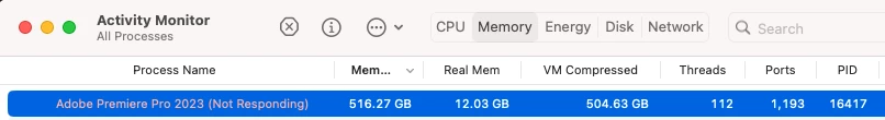 Same issue here. Activity monitor shows 500+ GB of VM Compressed Memory being used. It's happened several times over the last few weeks. I've restarted, cleared memory, and it still keeps happening. I generate a lot of small projects (usually less than a minute), and they all have 4K 60fps MP4 footage from a Sony a7siii. Occasionally, I will use GoPro Hero 10 clips and (more rarely) Mavic Air 2S clips. Most of the clips have time remapping, and most of them are nested and stabilized. These projects use a couple of After Effects compositions,  several instances of the same MOGRT (based on very complex After Effects compositions), and lumetri color across the board. I leave lumetri scopes open constantly (because I don't want to hunt for it when I need it).
