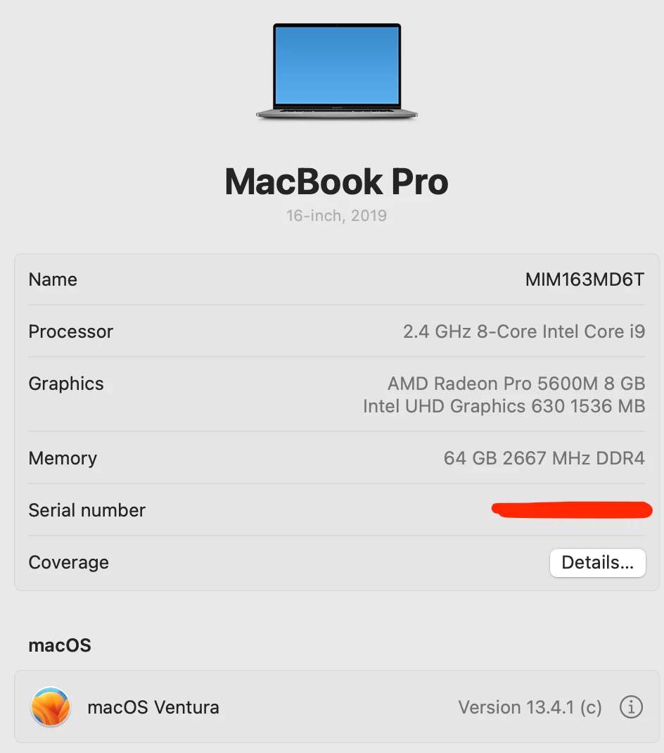 Laptop specs - Macbook Pro i7 CPU 32GB RAM M1.