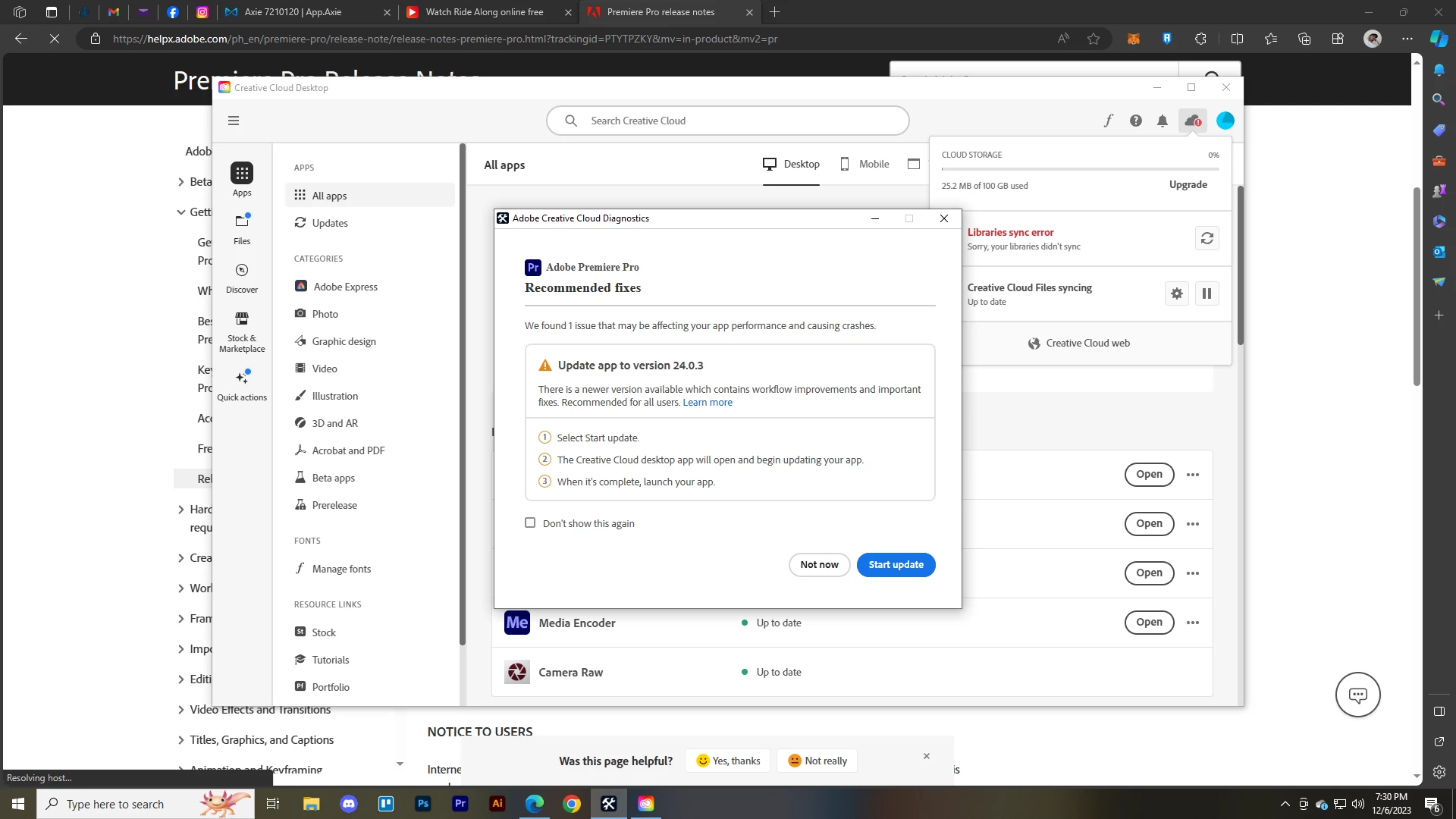 Can anyone knows how to fix this issue? I'm already up to date version but it keeps saying this issue. When I open my Premiere Pro "premiere pro quit unexpectedly while a project was open" also pops up then send report shows up.